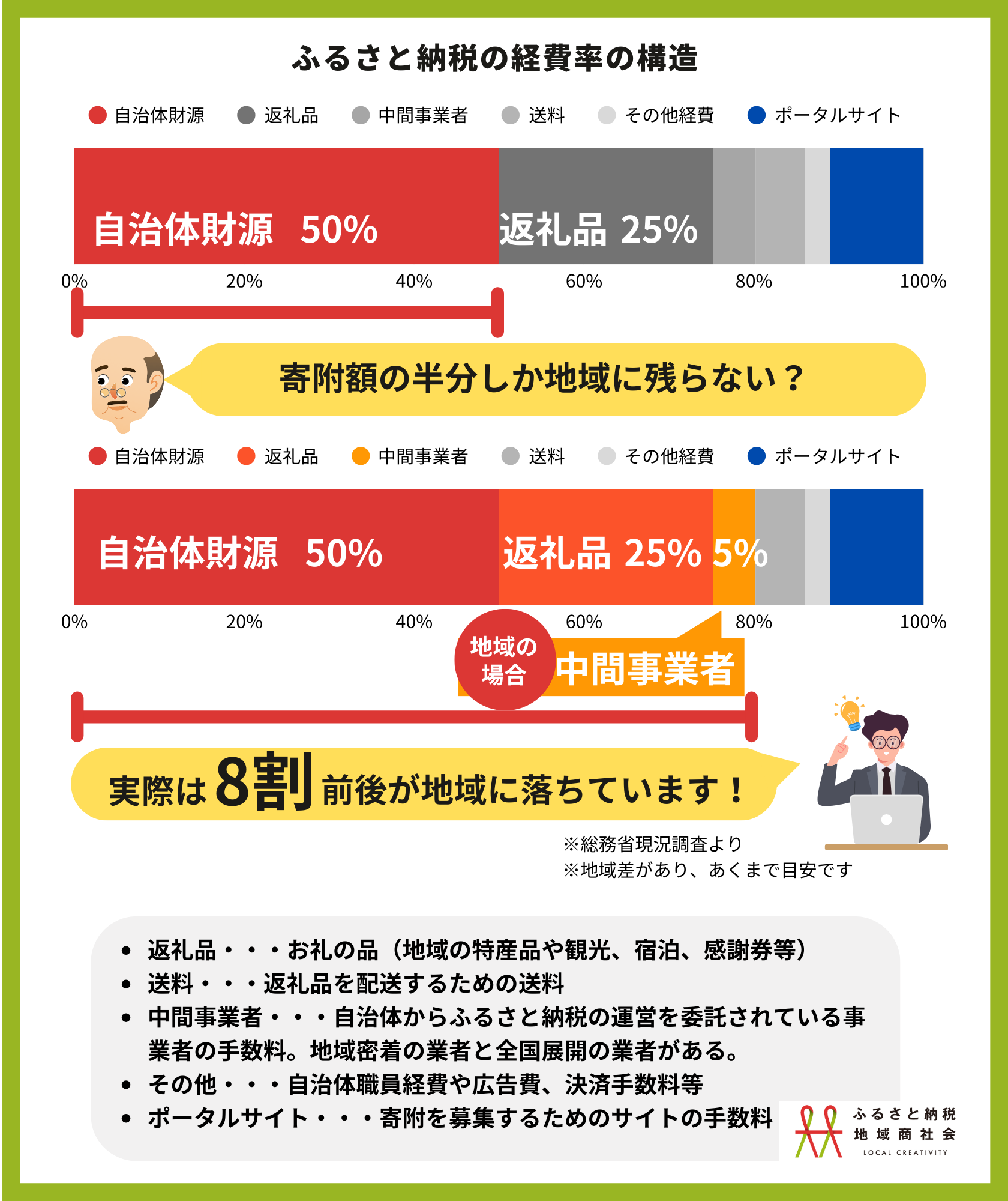 さらに、メディア等で「寄附額の50%しか地域に残らない」といった表現がなされることがありますが、実態とは大きく異なります。