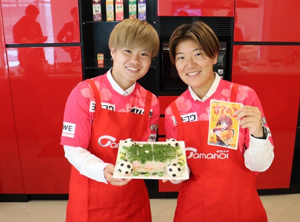 『すしのこ』を活用し、サッカーコートをモチーフにした「すしケーキ」作りに挑戦いただきました。 『すしのこ』で酢飯を作り、表面に青のりをまぶすことで芝生を表現。両選手ともにすしケーキ作りは初挑戦ということで、ケーキの土台にデコレーションする作業やサッカーボールのおにぎりを握る作業に苦戦している様子でした。「全然できない」と言葉を漏らしながらも、最終的には「すしケーキ作りって楽しい」、「意外とセンスあるかも」と言ったポジティブなコメントをいただき、両選手ともに満足した時間となりました。