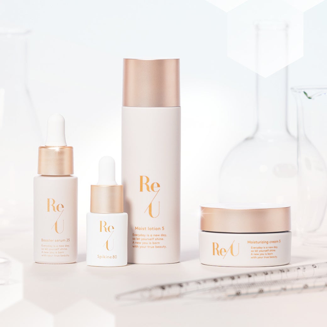 Re/U(リユー)は「Re·もどる」+ 「U(you)·あなた」 から生まれた造語です。 “あなた本来の美しい素肌に戻る”という気持ちを込めて立ち上げたスキンケアブランドです。原料となる幹細胞培養上清液は国内の提携ラボで自社培養士が精製し、安全性基準に則り管理しています。幹細胞培養上清液に含まれるたんぱく質は熱に弱い性質があるため、冷凍便でお届けします。