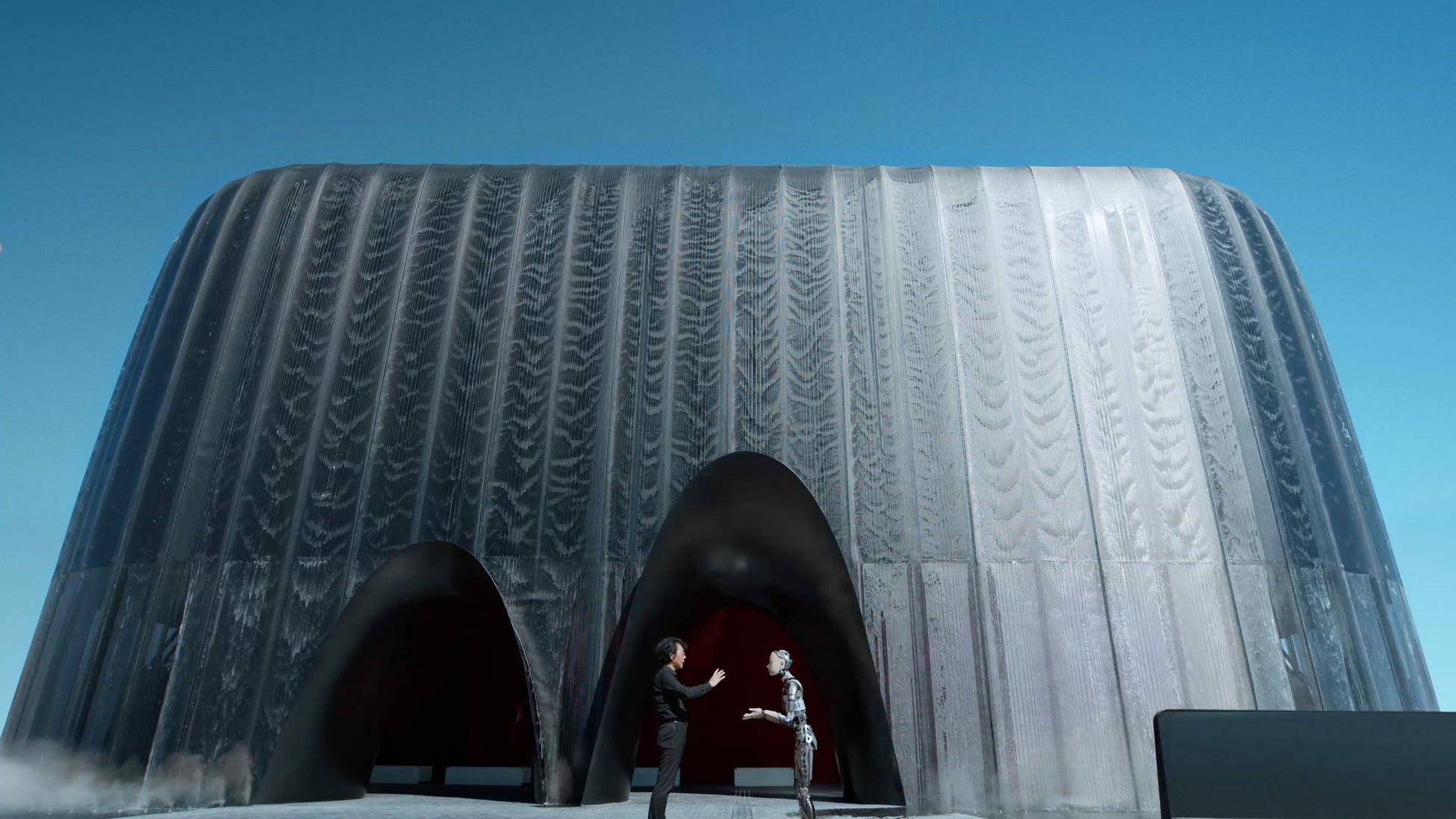 パビリオン建築は、「いのちは渚から拡がっていった」というコンセプトから着想を得てデザインされています。無生物と生物を結びつける“水”。“水”の都大阪。いのちの拡がりの源である“渚”。固体、液体、気体がぶつかり合い、ゆらぎながら境界を描く“渚”。“水”と“渚”はパビリオンにおいて象徴となる要素だと考えました。12mの高さの屋根から流れる水がパビリオンを包み込み、水のヴェールを潜り抜けて未来への旅が始まります。