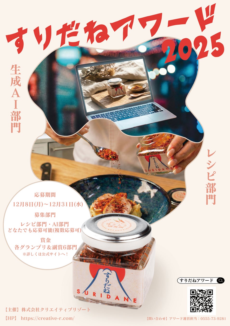 株式会社クリエイティブリゾート(本社:山梨県富士吉田市松山1603、代表取締役:加藤慎一)は、地域発の旨辛伝統調味料「すりだね」の魅力と可能性をさらに広げるべく、「すりだねアワード2025」を開催いたします。