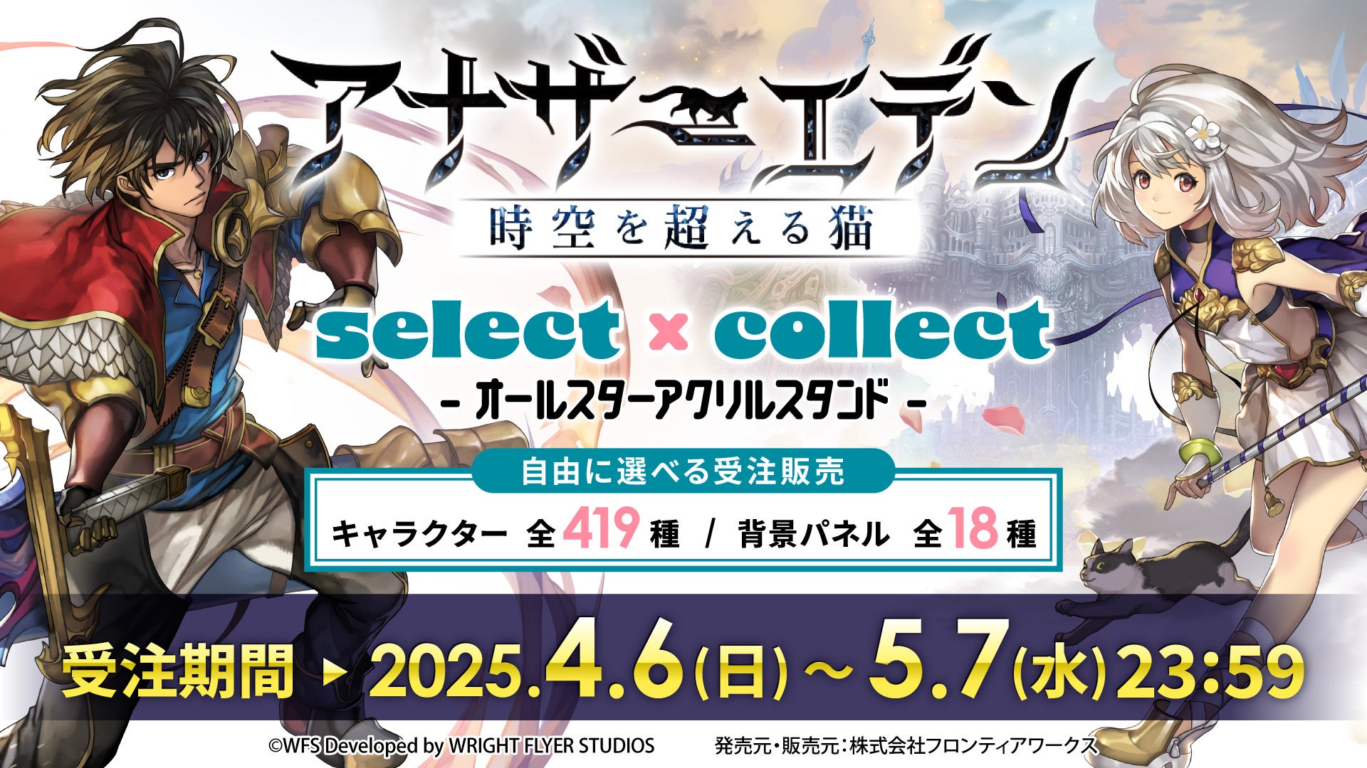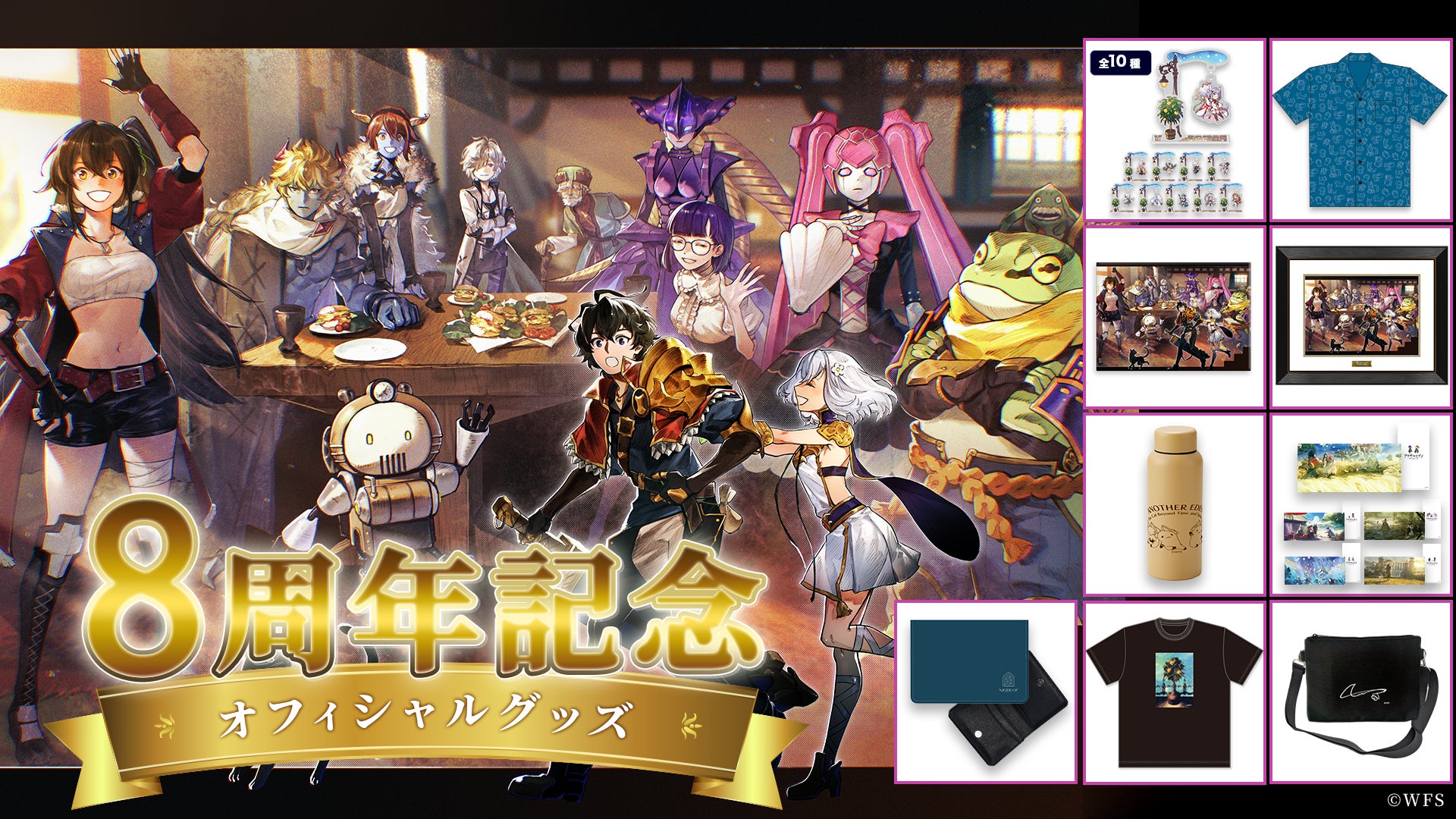 ライトフライヤーストアにて「8周年記念オフィシャルグッズ」の事後通販を2025年4月5日(土)より開始しました。また、アクリルスタンド1個から自由に選べる受注販売グッズ「select×collect」より、アナザーエデンのプレイアブルキャラクター全スタイル419種が発売が決定しました。キャラクターのほか、冒険の舞台をもとにした背景パネル全18種も販売を予定しています。