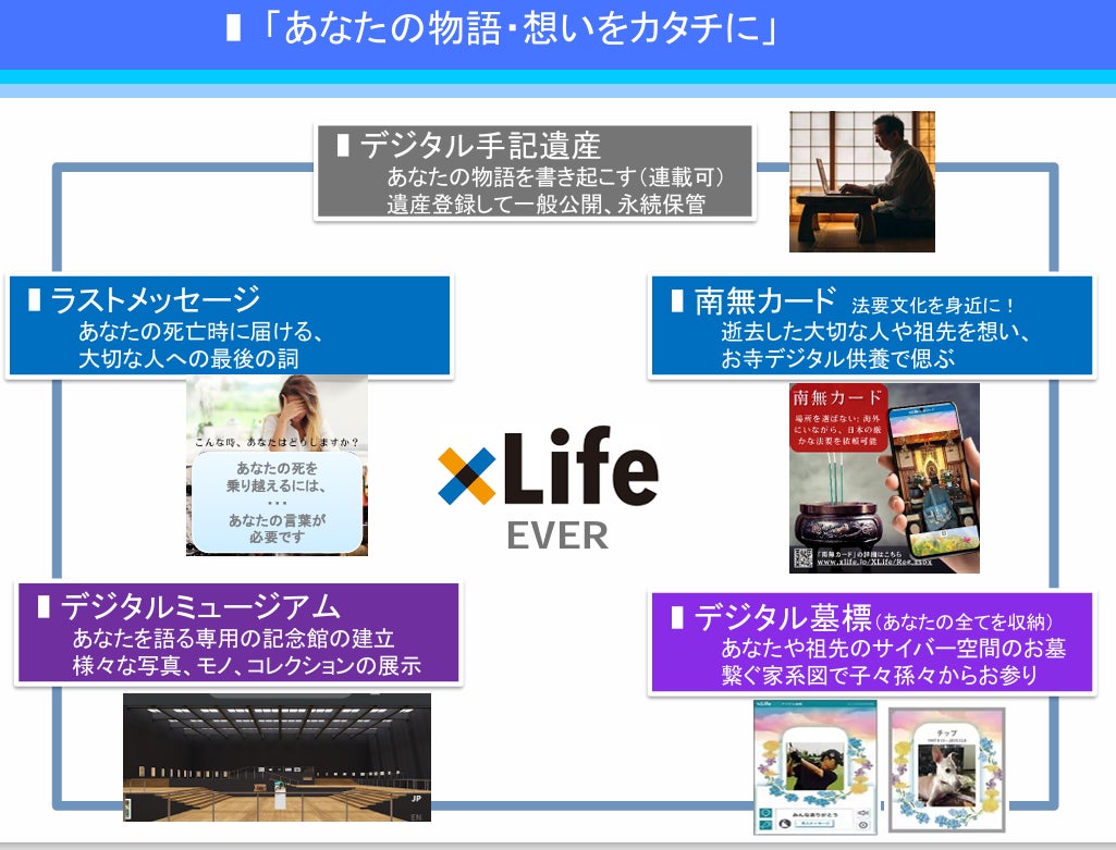 当協会ではxLifeでのサービス「デジタル手記遺産」と共に、自分の不慮に備えての大切な人への「ラストメッセージ」、亡くなった大切な人を場所や時間を気にせずお寺に供養をお願いして偲ぶ「デジタル法要南無カード」、自分の人生の物語を展示する私の記念館「デジタルミュージアム」、そして将来のお墓が不透明な中で自分で建立するサイバー空間の「デジタル墓標」を、
