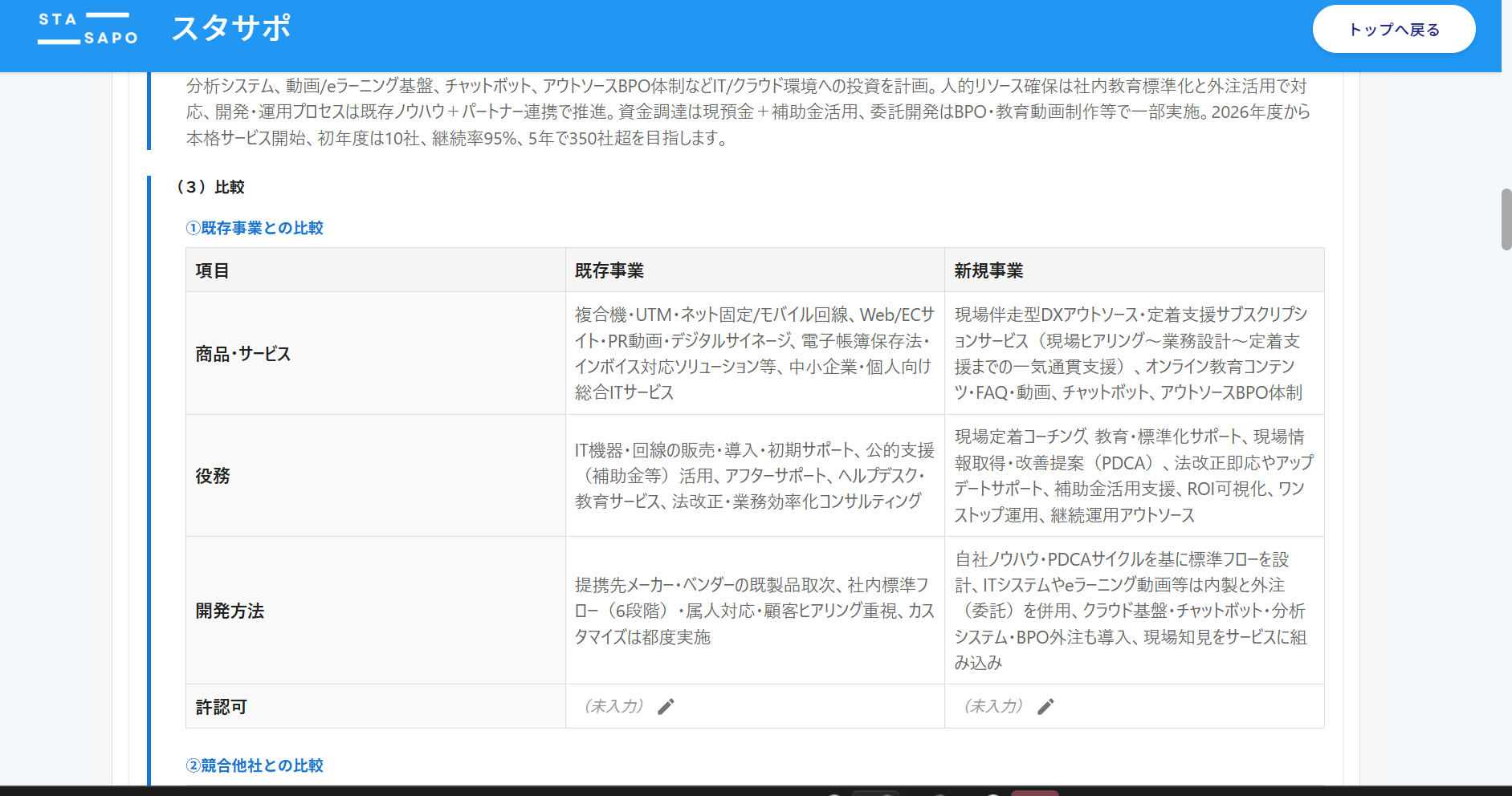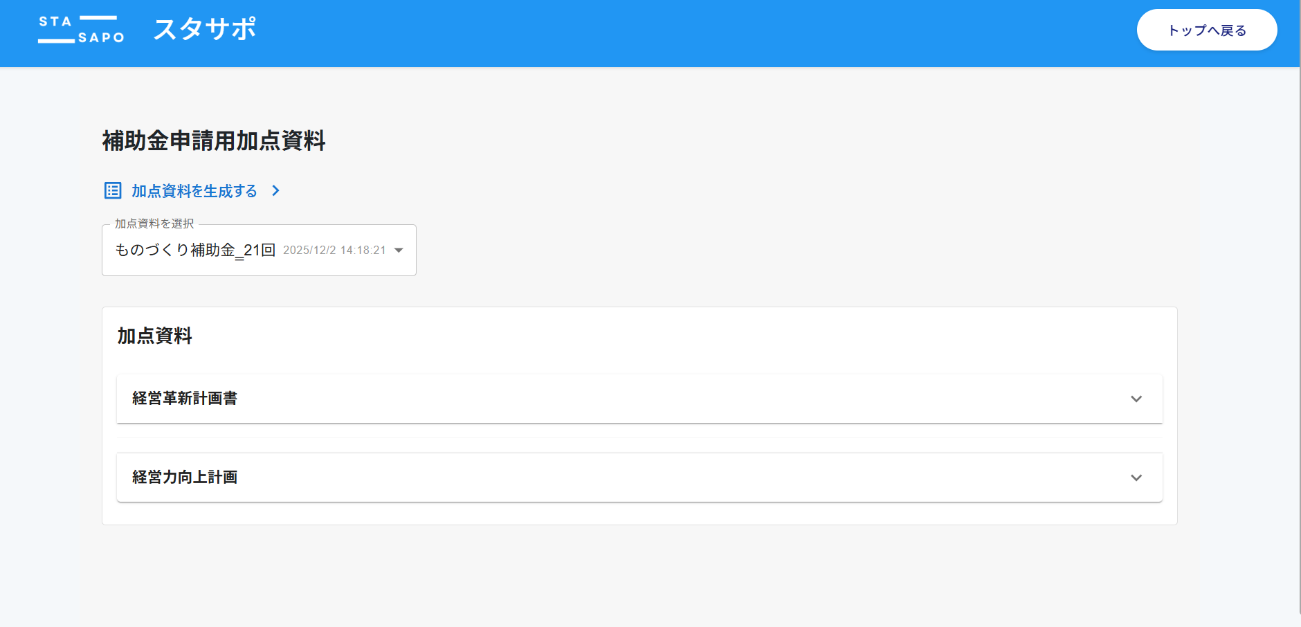 株式会社スタートアップサポーター(本社:東京都港区赤坂四丁目8-19-3階、代表取締役:小野昌男)は、経営革新計画書および経営力向上計画書の2種類の計画書を同時に約5分で作成できる新機能を、補助金申請支援サービス「スタサポ」に搭載し、本日、2025年12月2日にリリースいたしました。