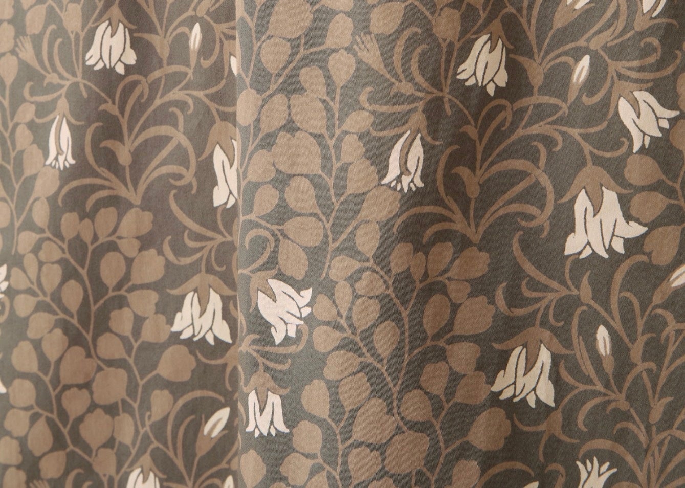 シダとキキョウの花の総柄「Maidenhair and Harebell」は、装飾芸術家C.F.A. ヴォイジーが1929年にデザインしたテキスタイルに基づいています。ミニマリズムの手法を取り入れた静かな表現力と、落ち着いたブラウン系の色展開が上品な印象です。