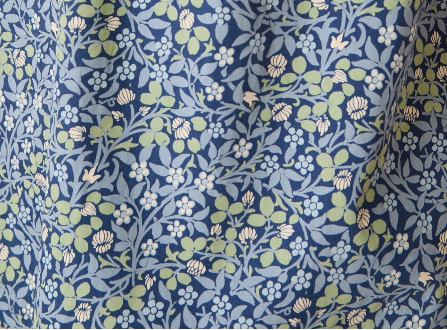 クローバーとサンザシの花を組み合わせた総柄「Clover」は、1903年にジョン・ヘンリー・ダールがモリス商会のためにデザインした壁紙に基づいています。自然への愛があふれるデザインで、ブルー系の同系色の色展開が涼しげでさわやかな印象です。