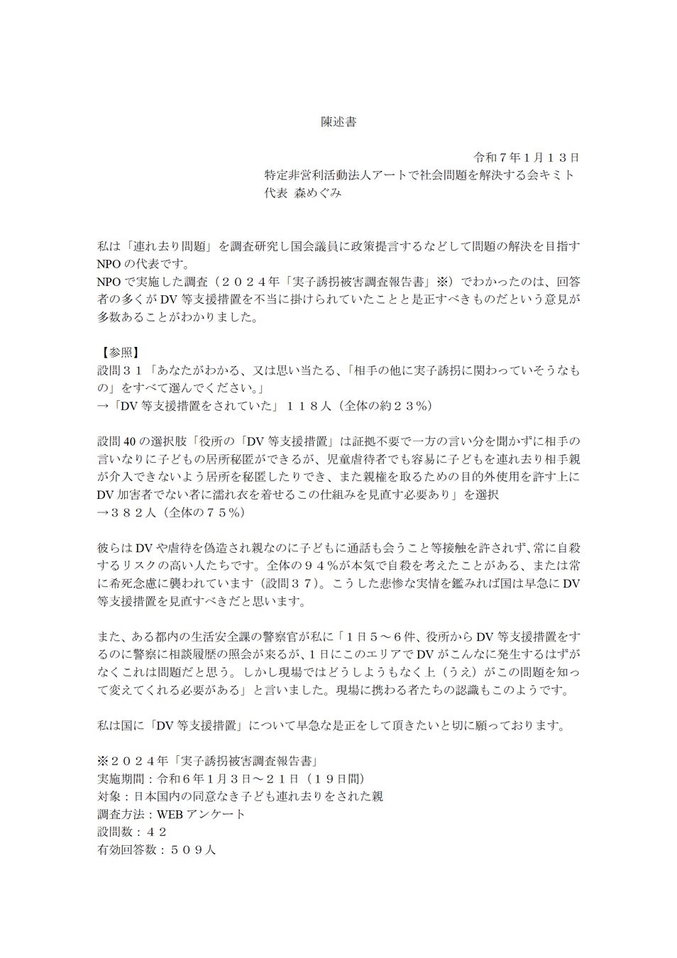 「陳述書」は、実子誘拐被害者509名の方からご協力いただいた「第1回実子誘拐被害調査」の結果をいかしております。2つの設問で「DV等支援措置」に関する選択肢が1つずつありその結果から、「被害は深刻で早急に解決されるものでそのためにはまず国(総務省)が責任者であると明確にする必要がある」意見を記しております。
