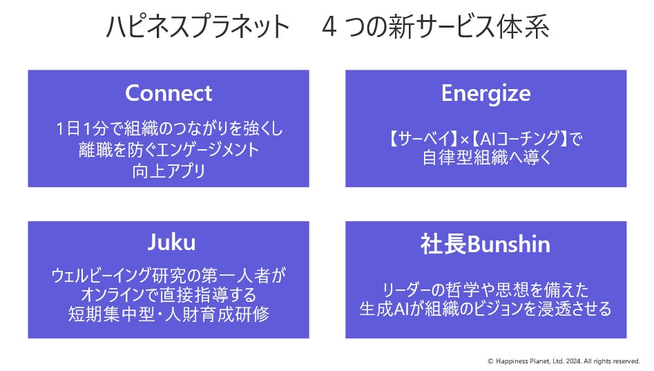 ハピネスプラネットはこれまで「Happiness Planet Gym」を通じて、組織内でのエンゲージメント向上を支援してきましたが、新サービスでは4つのサービスに再編し、企業がより体系的かつ持続的にウェルビーイング経営を実現できるソリューションを提供します。