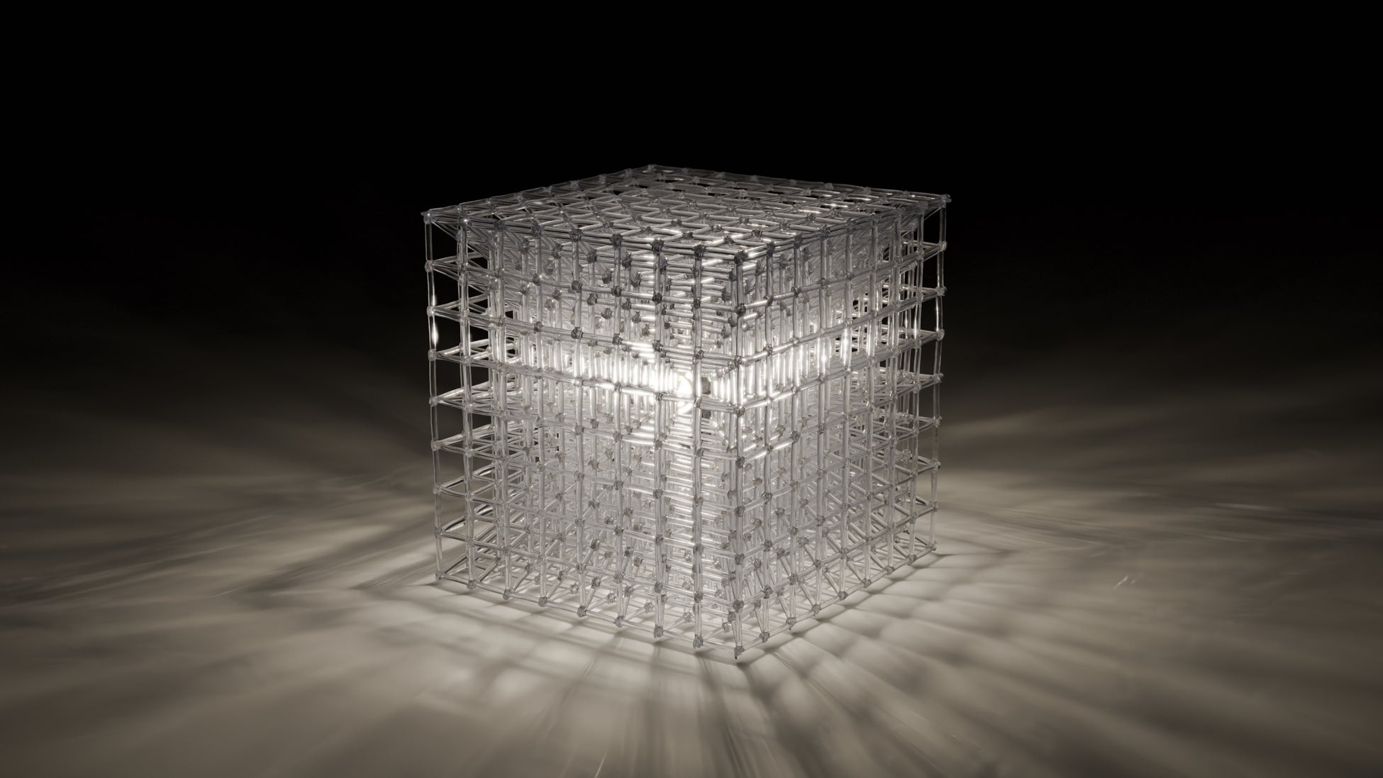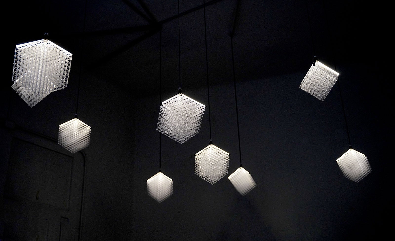 三次元格子が光を捕え多重反射。空間を光のキャンバスへ変えるキューブ型ペンダントライト。