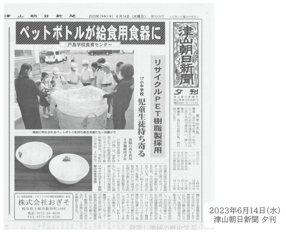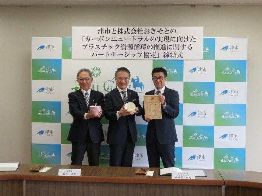 株式会社おぎそは「永く愛される人に優しい商品を」企業理念とし、脱炭素(カーボンニュートラル)にむけた取組としてプラスチック資源循環促進法に則り、ペットボトルを使用したリサイクルPET樹脂食器を三重県津市の給食用食器として提供し、2025年3月18日に三重県津市とカーボンニュートラル実現に向けたプラスチック資源循環の推進に関する協定書を締結しました。