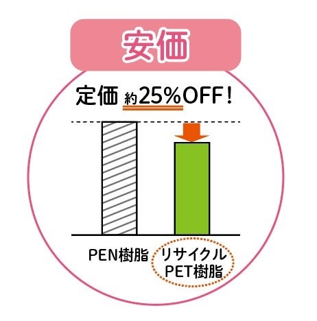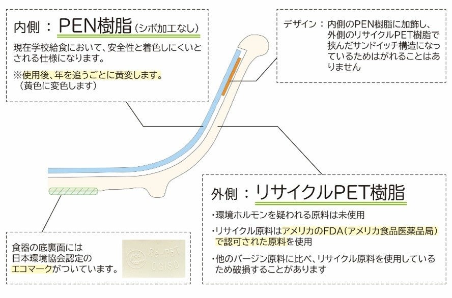 ③ コスト:学校給食用食器として導入事例の多い、PEN樹脂より安価でありコスト削減に寄与