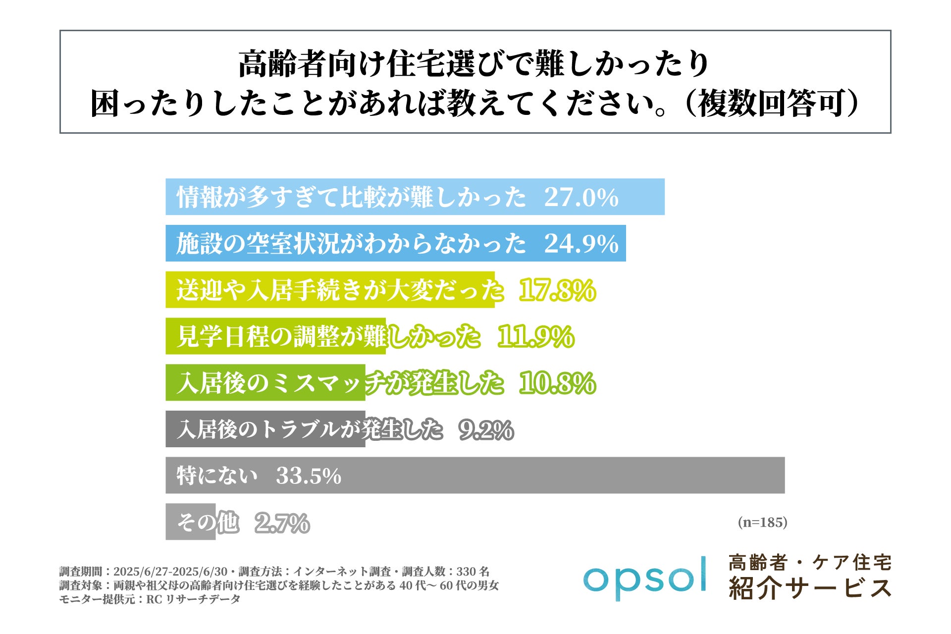 また、両親や祖父母の最初の高齢者向け住宅を自分で探して選んだと回答した人を対象に「高齢者向け住宅選びで難しかったり困ったりしたこと」を尋ねる設問への回答では、1位が「特にない」で33.5%、2位が「情報が多すぎて比較が難しかった」で27.0%、3位が「施設の空室状況がわからなかった」で24.9%という結果になりました。この結果から、高齢者向け住宅選びで難しかったり困ったりしたことは「特にない」という人が最も多かったものの、「情報が多すぎて比較が難しいこと」や「施設の空室状況がわからないこと」に困難を感じた人も一定数いることが明らかになりました。