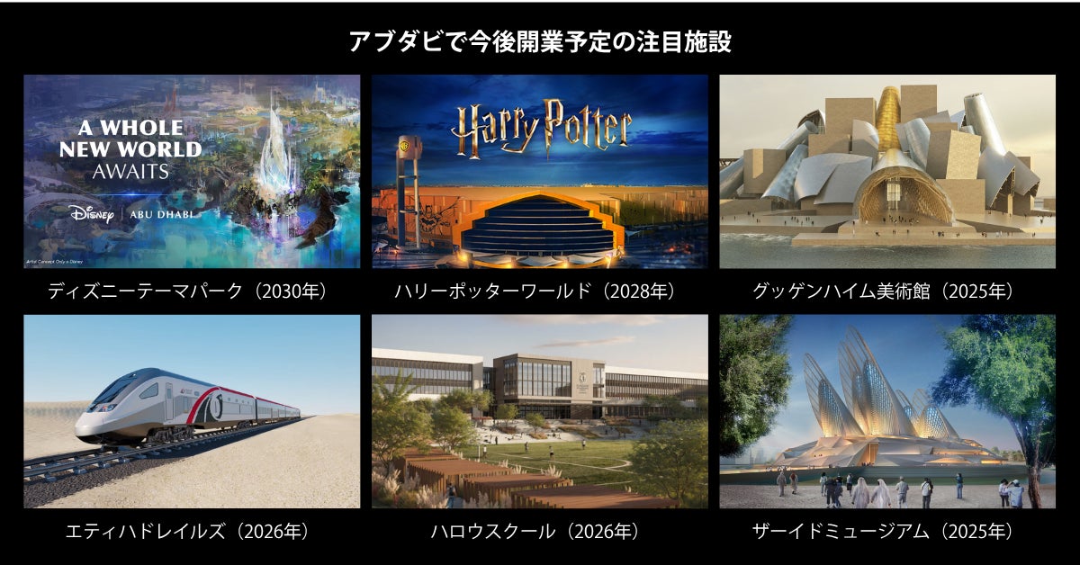 2025年5月、世界で7番目となるディズニーのテーマパークが発表され、世界中から大きな注目を集めました。さらに、ハリー・ポッター・ワールドやグッゲンハイム美術館、ザーイド国立博物館など、話題性の高い観光施設のオープンも予定されています。加えて、エティハド鉄道がドバイ国際空港とアブダビ国際空港を結ぶことで、今後さらなるインフラ整備の進展が期待されています。