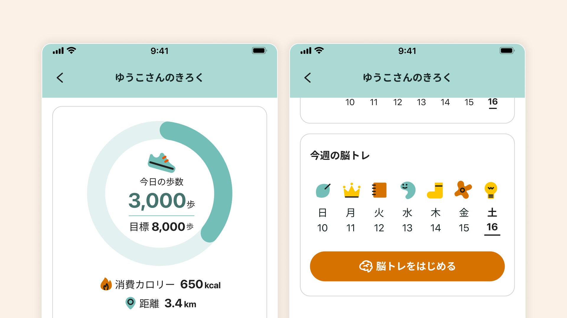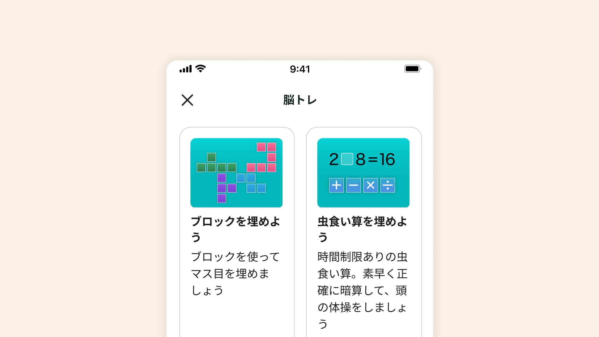 計算問題や記憶ゲームなど、スキマ時間に手軽に楽しく取り組める全10種類の脳トレゲームを搭載。脳の活性化を促し、認知機能の維持をサポートします。