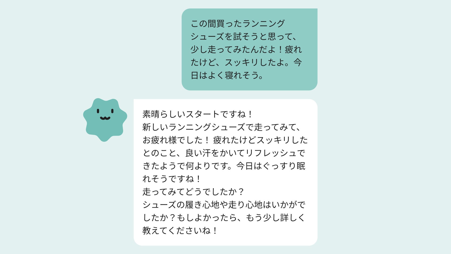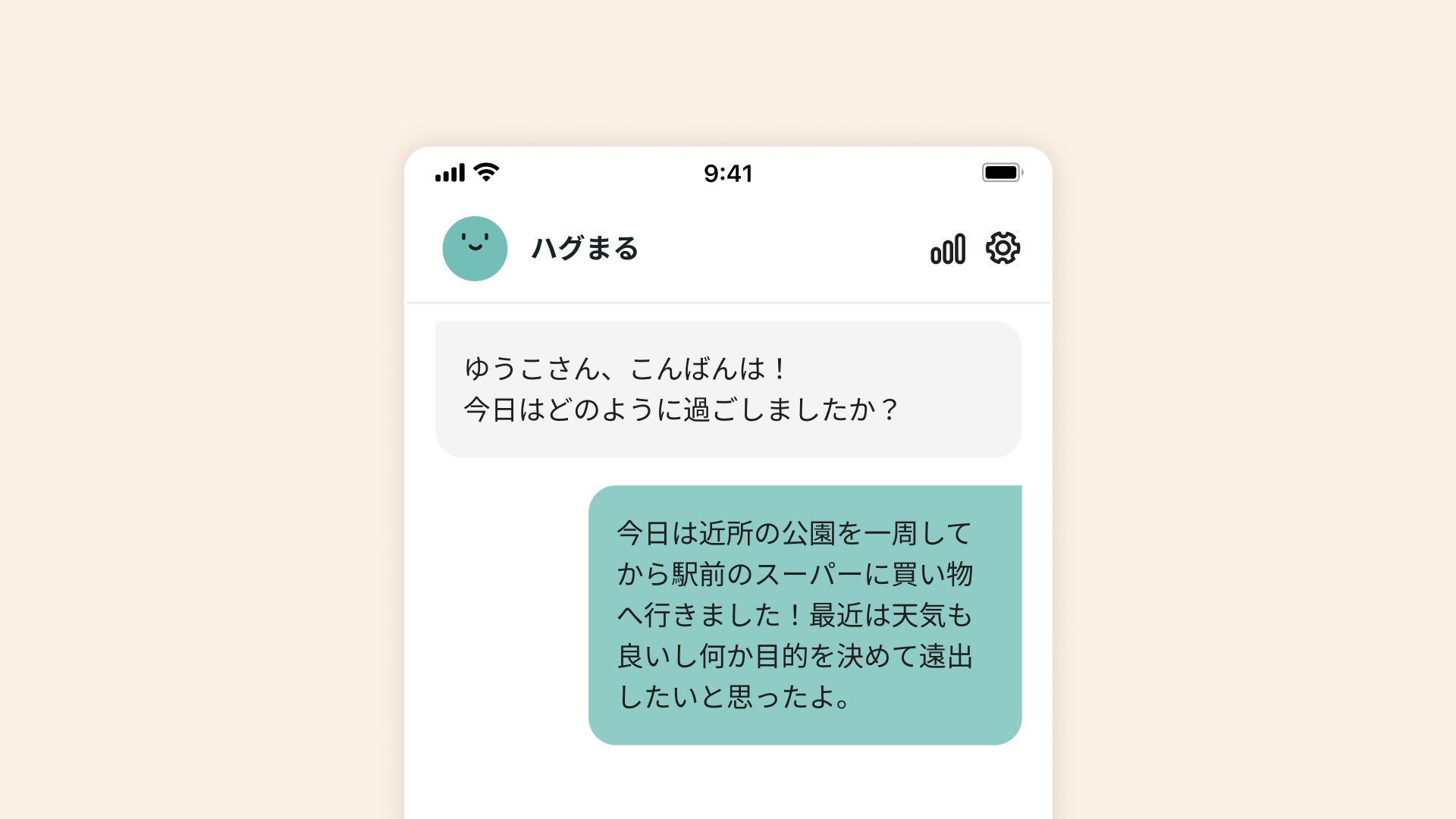 AIとの会話を続ける事で、キャラクターの「ハグまる」が反応してさらに会話が弾むなど習慣化につながる機能の開発を継続。また、記録機能を拡充し、食事や睡眠などのデータ管理を追加したり、会話の傾向や行動変容に繋がった重要キーワードの可視化、自分史やタイムラインで振り返る機能も追加していきます。 -