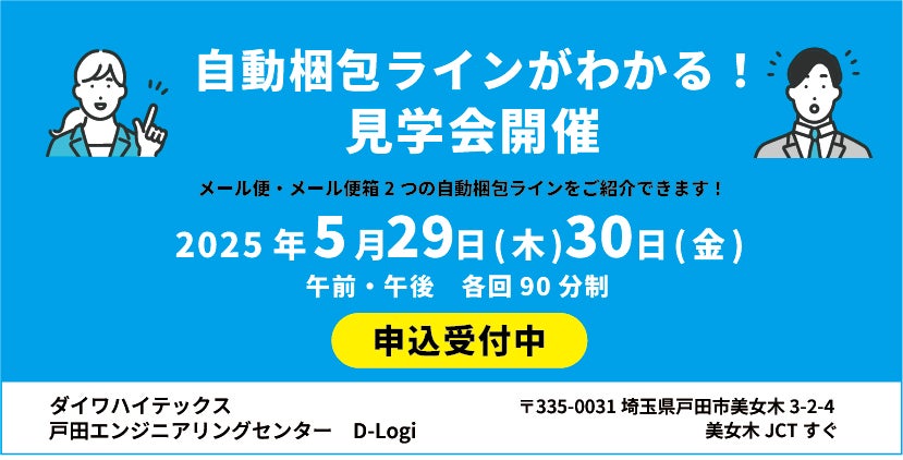 自動梱包ラインの開発・製造・販売を行う株式会社ダイワハイテックス(本社:東京都板橋区、代表:大石 智也)は、自動梱包ラインが「わかる」見学会を5月29日(木)30日(金)に開催します。