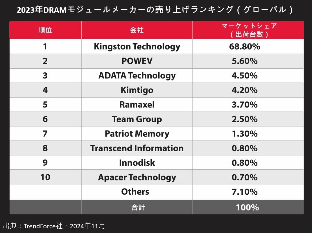 台北–11月 14日, 2024 – メモリストレージ製品および技術ソリューションの世界的リーダーであるKingston Technologyは本日、アナリスト企業であるTrendForce社による最新の売上高別ランキングにおいて、サードパーティDRAMモジュールサプライヤーとして世界トップにランクインしたことを発表しました。Kingstonは推定68.8%の市場シェアを保持し、21年連続でグローバルリーダーの地位を確立。TrendForceによると、2023年のDRAMモジュール市場全体の売上は前年同期比で28%減少しましたが、Kingstonは微減にとどまり、引き続きトップの地位を維持しました。
