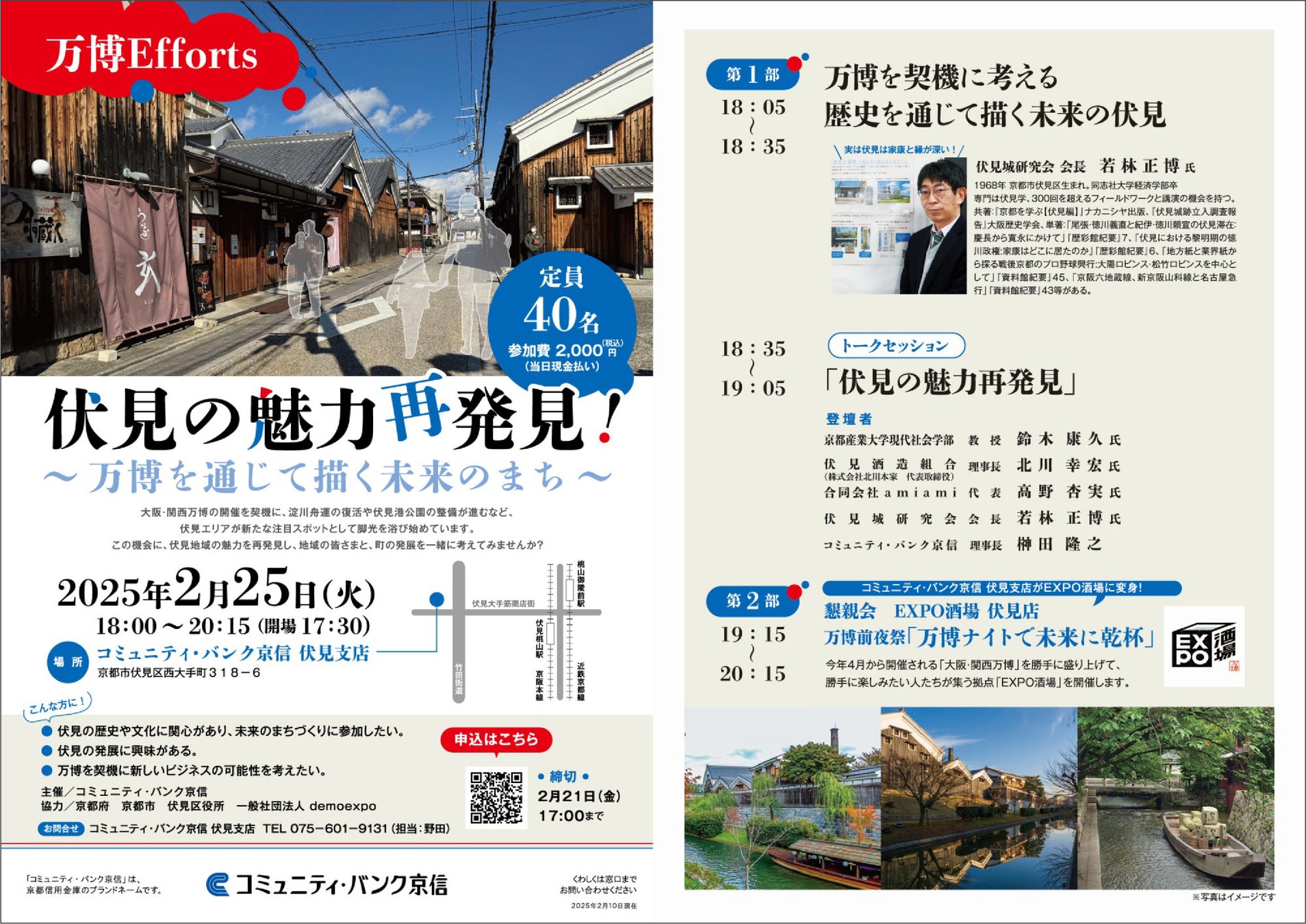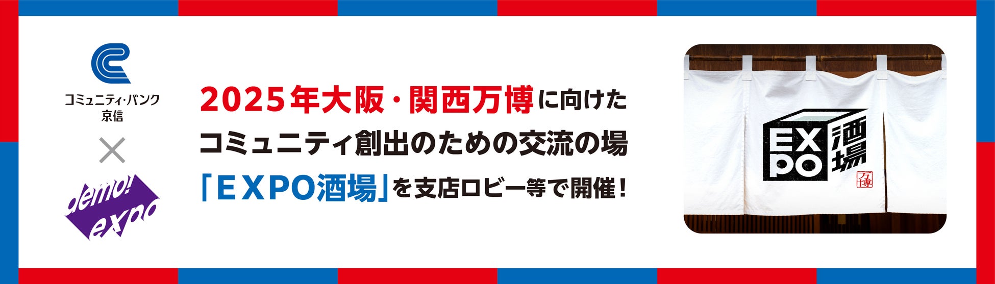 大阪・関西万博から生まれる価値を街に残し、まちごと万博をつくる活動を行っている、一般社団法人demoexpo(所在地:大阪府大阪市西区京町堀1-12-11 愛晃ビル4F/代表理事:花岡、以下demo!expo)は、コミュニティ・バンク京信(法人名:京都信用金庫、本店:京都市下京区、理事長:榊󠄀田 隆之)と共創し、京都府の多くの地域を対象に、「EXPO酒場」を開催します。万博の機運醸成を図るだけでなく、万博を契機に、京都の地域コミュニティの価値を高める活動を推進して参ります。