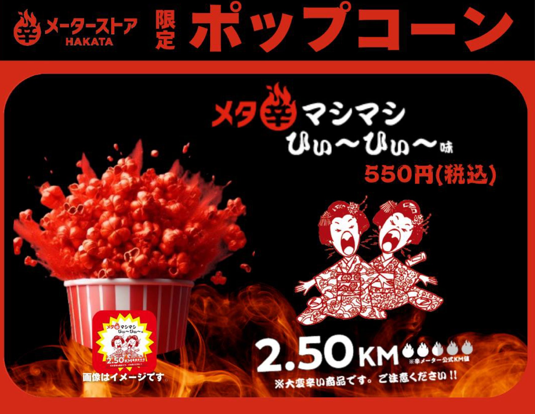 中でも湖池屋「カラムーチョ」と京都の大人気唐辛子「舞妓はんひぃ〜ひぃ〜」がコラボしたポップコーンや、味のめんたいこ「ふくや」と辛メーター1日店長のゴリけんさんとのコラボ商品など、「辛メーターストア HAKATA」でしか手に入らない、旨辛&レアアイテム満載です!