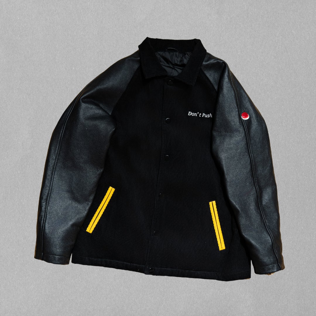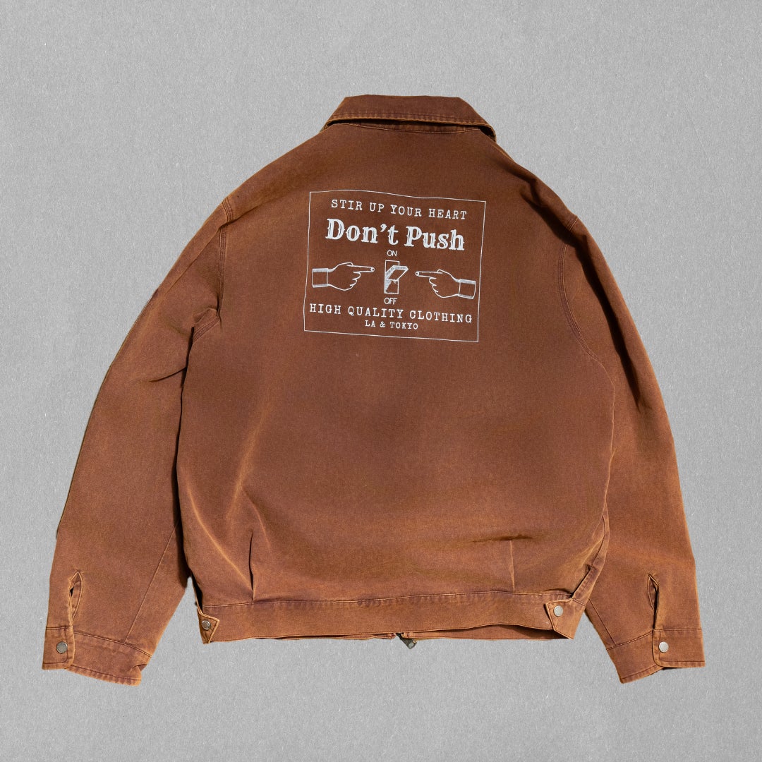 「Don’t Push」というブランド名は、「○○するな、と言われると○○したくなる」心理現象、通称カリギュラ効果に由来。背中のボタンロゴが特徴。