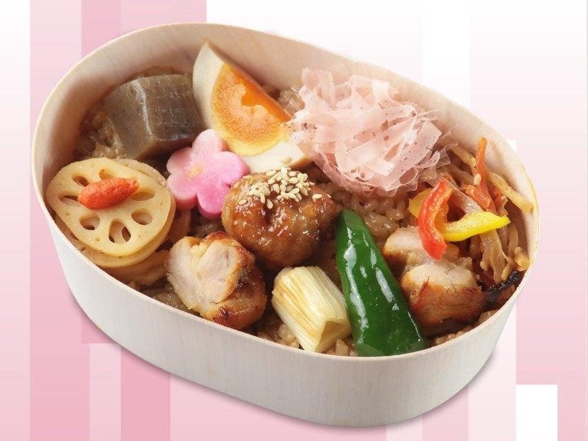 上の画像は、ご飯だけでも美味しい「鶏めし」を詰め、焼き鳥やつくねなどを彩り良く載せた、まさに鶏三昧の【東京鶏めしちびわっぱ】。半熟煮玉子の黄色と、削り蒲鉾や花麩のピンクのコントラストが、「映える」お弁当です。