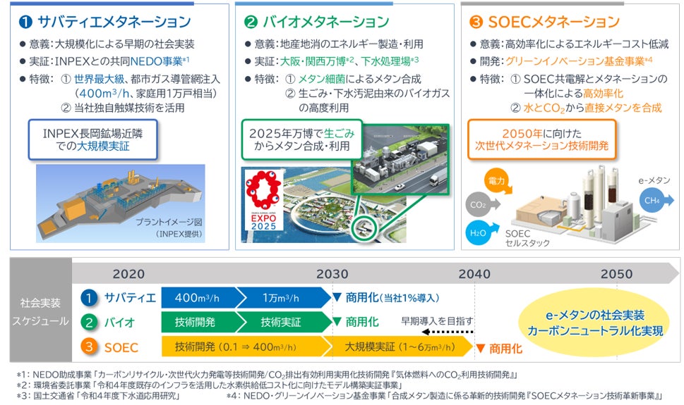 Daigasグループは、e-メタンを都市ガスのカーボンニュートラル化を実現する新エネルギーとして普及させるため、日本国内での技術開発・実証に加え、北米・南米・豪州・中東・東南アジアでのe-メタン製造事業を検討しております。日本を含むアジア地域のカーボンニュートラル化に向けて、アジア地域でのe-メタンの利用・普及を目指しています。