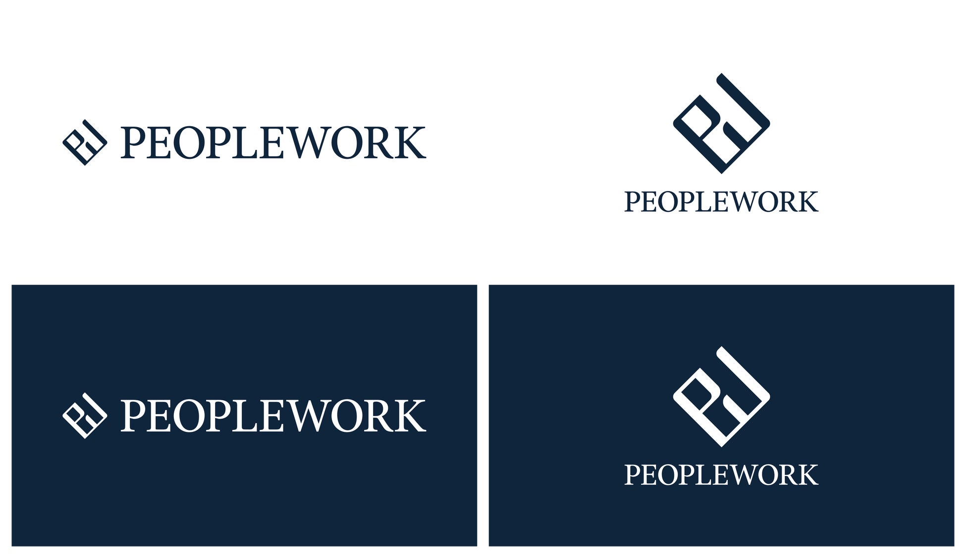 「PeopleWork」のロゴは、伝統的なセリフ体のロゴタイプで信頼感と安心感を表現し、「People」と「Work」の頭文字を結びつけた菱形のシンボルマークは、「社員の成功が会社の成功に直結する」という我々の理念を象徴しています。そして、菱形の上部が開かれていることで、成長と上昇をより強調して表現し、伝統(文字)とモダン(シンボル)の調和によって、個々の多様な個性・才能を活かす社会の実現という我々の思いを表現しています。