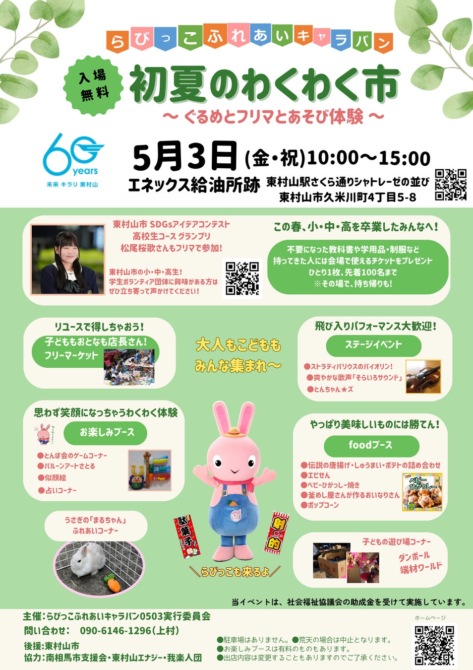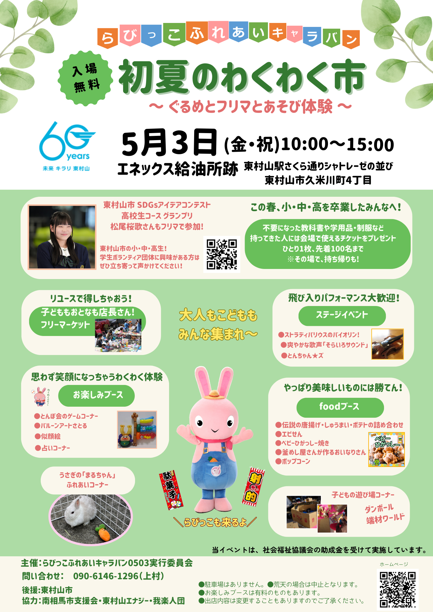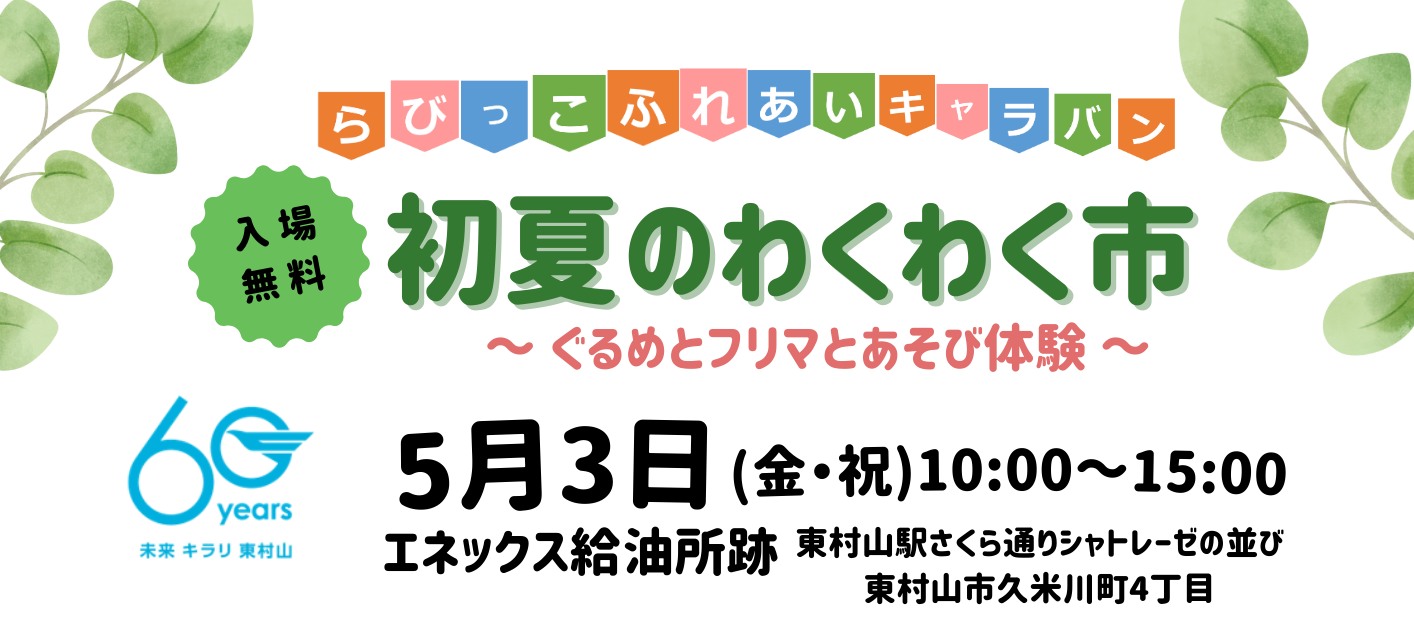 東村山市市制施行60周年記念事業イベント開催!らびっこふれあいキャラバン「初夏のわくわく市」~ ぐるめとフリマとあそび体験 ~