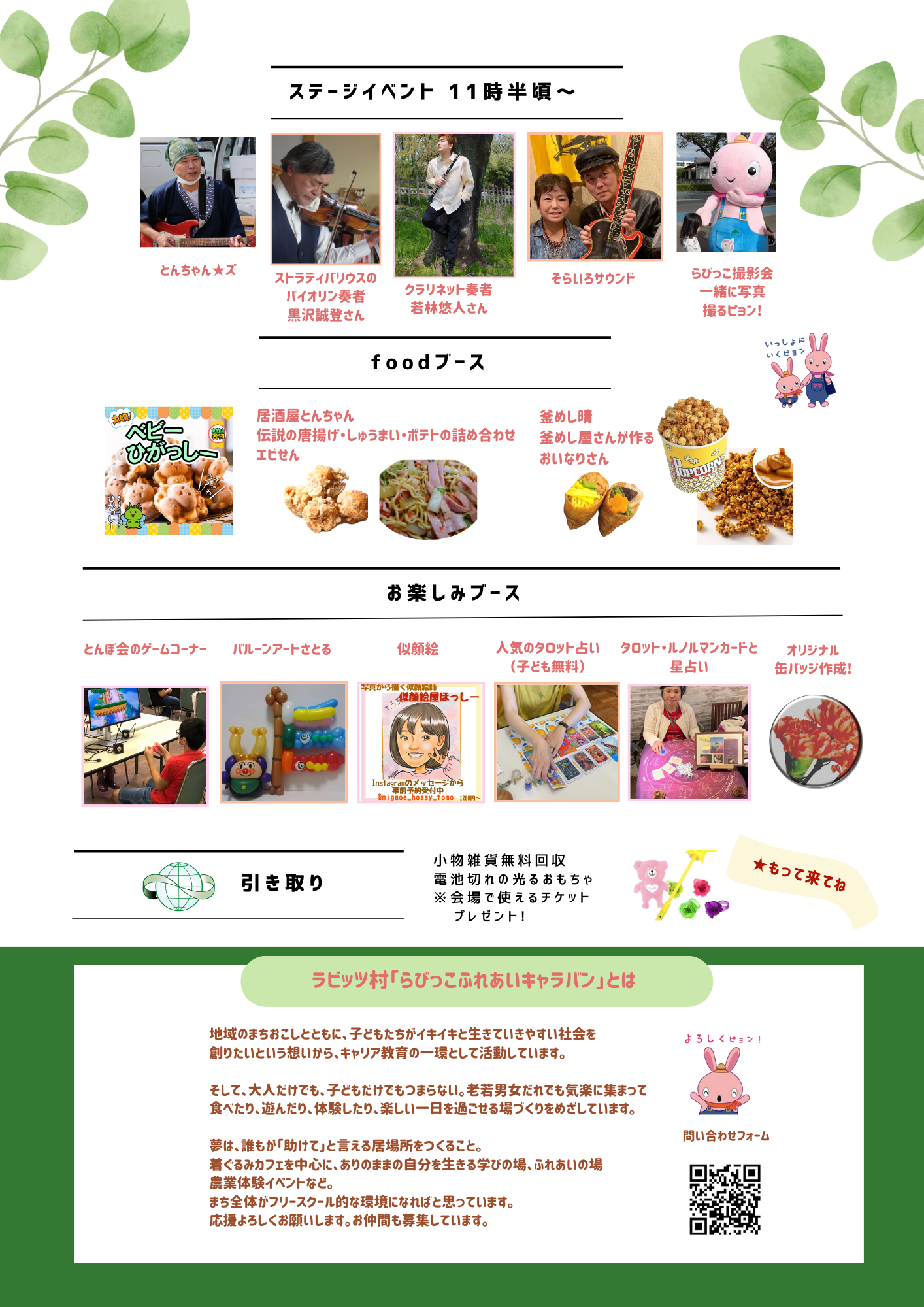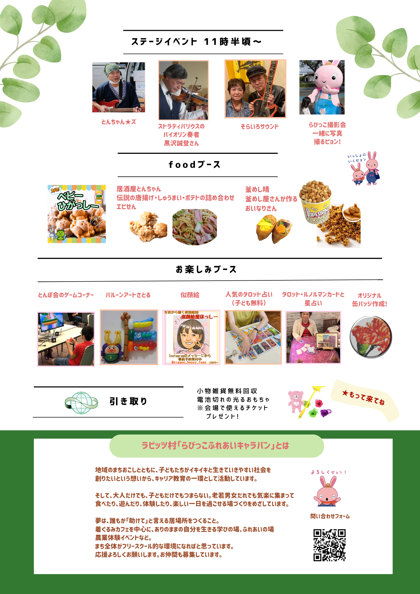 ステージイベントでは、ストラディバリウスのバイオリンやクラリネットの演奏、子どももおとなも店長さんのフリーマーケット、お楽しみブースでは、eスポーツのゲームコーナー、バルーンアート、似顔絵、占い、美味しいfoodなど。うさぎとふれあいコーナーも!