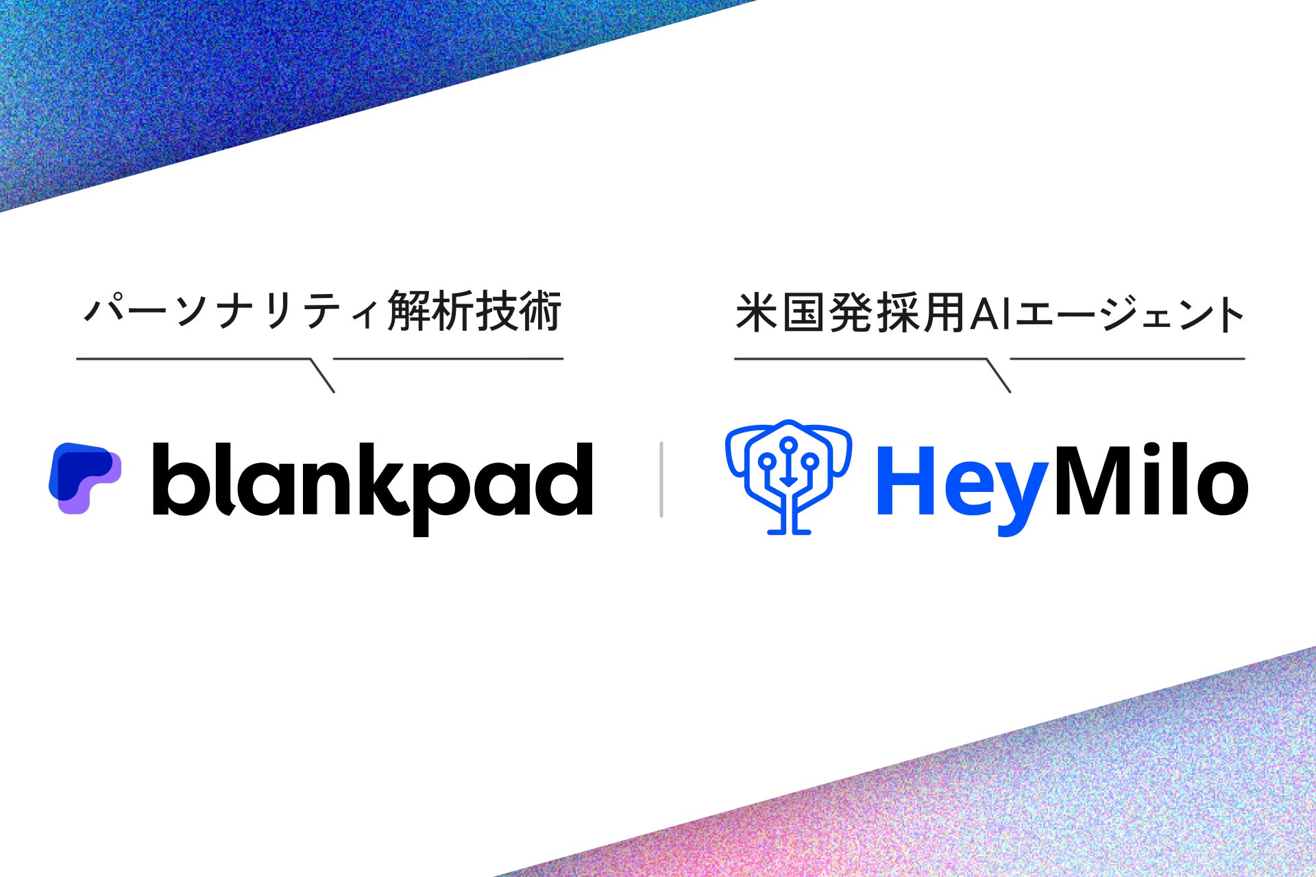 株式会社blankpad(本社:東京都、代表取締役:篠﨑 健伸、以下「blankpad」)は、米国の採用AIエージェント企業 HeyMilo(DBA of Redsnack Technologies Inc., 本社:New York、Co-Founders:Sabashan Ragavan、Ramie Raufdeen、以下「HeyMilo」)と、日本市場における独占販売を含むパートナーシップ契約を締結しました。blankpadが有するパーソナリティ解析技術とHeyMiloの一気通貫型採用AIエージェントを統合し、個社ごとの必要な人物像に沿って評価アルゴリズムを最適化した形で応募前アプローチから書類選考・面接・評価・日程調整に至るまでを全自動化。これによりすべての候補者を公平・正確・迅速に評価することが可能となります。