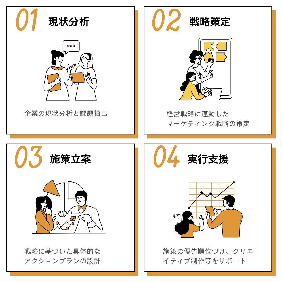 本事業では、お客様の課題を深く理解した上で、戦略設計から具体的なアクションプランへの落とし込み、クリエイティブ制作や施策の実行まで、企業のマーケティング活動を包括的にサポートします。