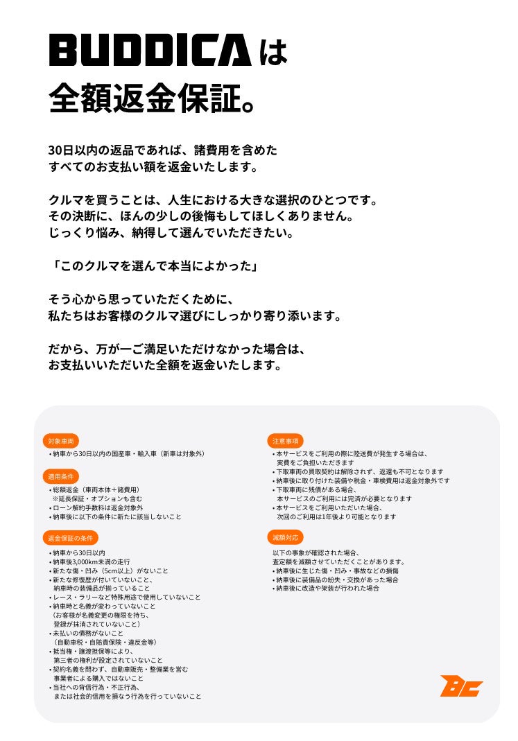 WebやLINEのやり取りだけで中古車販売を全国規模で展開するバディカダイレクト株式会社 (URL: https://buddica.direct /本社:東京都渋谷区 / 代表取締役社長:中野 優作)は、2025年3月1日(土)よりバディカダイレクト、およびバディカ店舗でクルマを購入後、納車から30日以内の購入キャンセル(返品)には数料・税金など含めての全額返金保証を決定しました。なお今回の決定は全国のバディカ店舗(URL: https://www.buddica.jp/)でも同様に実施させていただきます。