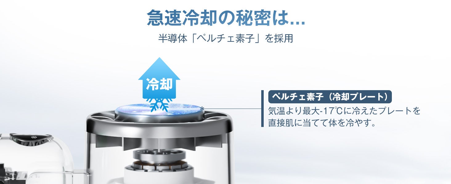 最先端の半導体冷却技術「ペルチェ式冷却プレート」を搭載し、首元や手首、額に軽く当てるだけで、1秒もかからずひんやりとした涼しさを実感できます!さらに、ファンから吹き出す風が汗を素早く蒸発させ、冷却と送風のダブル効果で、より快適な体感温度を提供します。