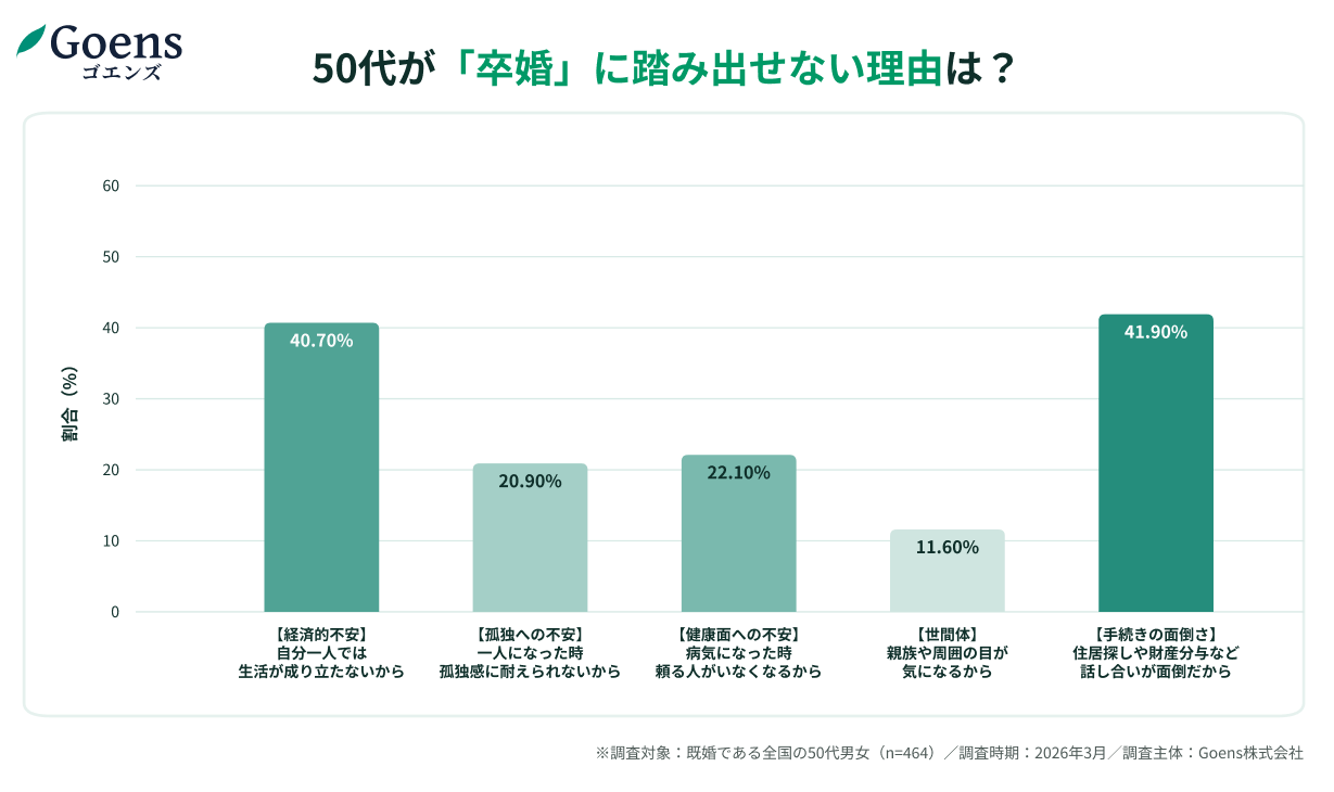 卒婚に憧れつつも踏み出せない理由のトップ2は、「手続きの面倒さ(41.9%)」と「経済的不安(40.7%)」。理想だけでは超えられないシビアなハードルが浮き彫りになりました。
