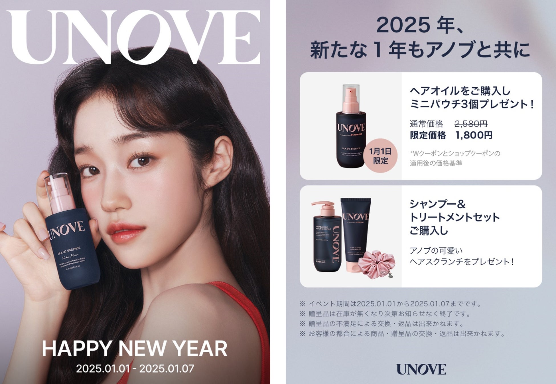 「羨望の柔らかさと香りで「私」を解き放つ」がコンセプトの韓国発のパーソナルケアブランド「UNOVE」は、2025年1月1日(水)~7日(火)までの期間、Qoo10のUNOVE公式ストアにて新年セールを開催いたします。大人気のUNOVEオリジナルヘアシュシュが貰える限定セットや、1月1日限定で開催される特別企画も用意しています。この機会に是非UNOVE製品をお試しください。