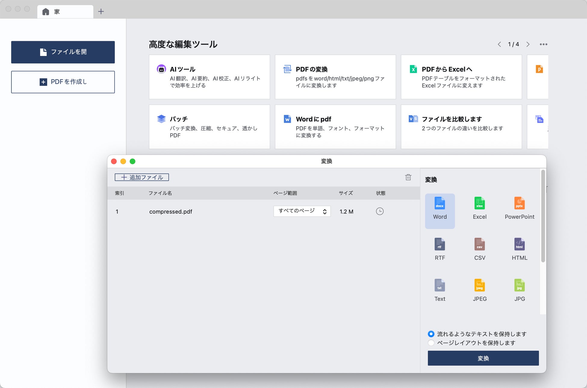 元のフォーマットを保留した上でPDFファイルをMS Office、CSV、RTF、テキスト、HTML、PDF/Aまたはイメージ形式にエクスポートします。PDFファイルを作成したり、一括変換または部分的な変換をサポートしたりします。さらに複数のファイルをPDFに結合することもできます。