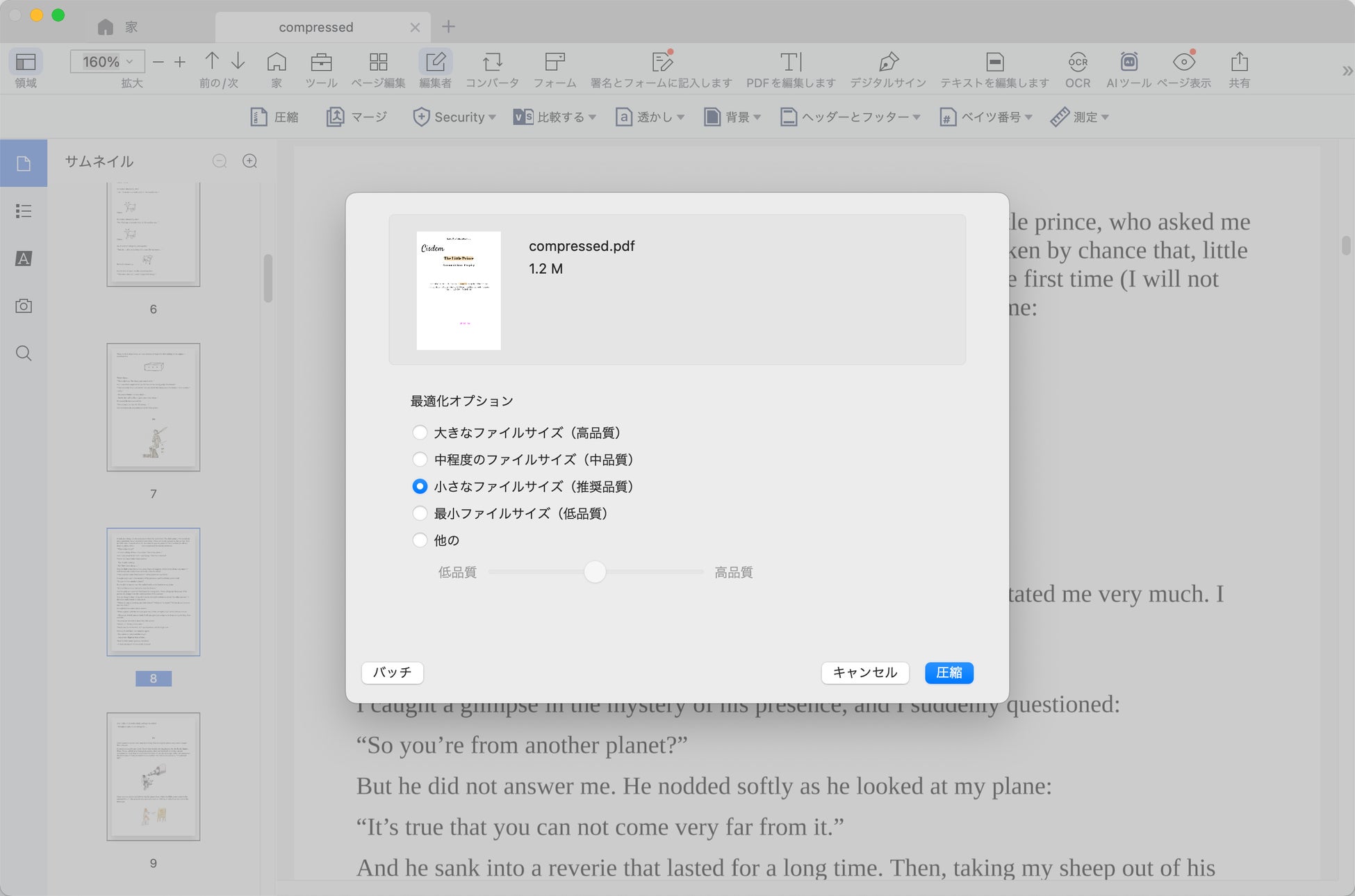 「低い、中程度、高い、カスタマイズ」というプリセットした4つの圧縮レベルでPDFのサイズを小さくします。