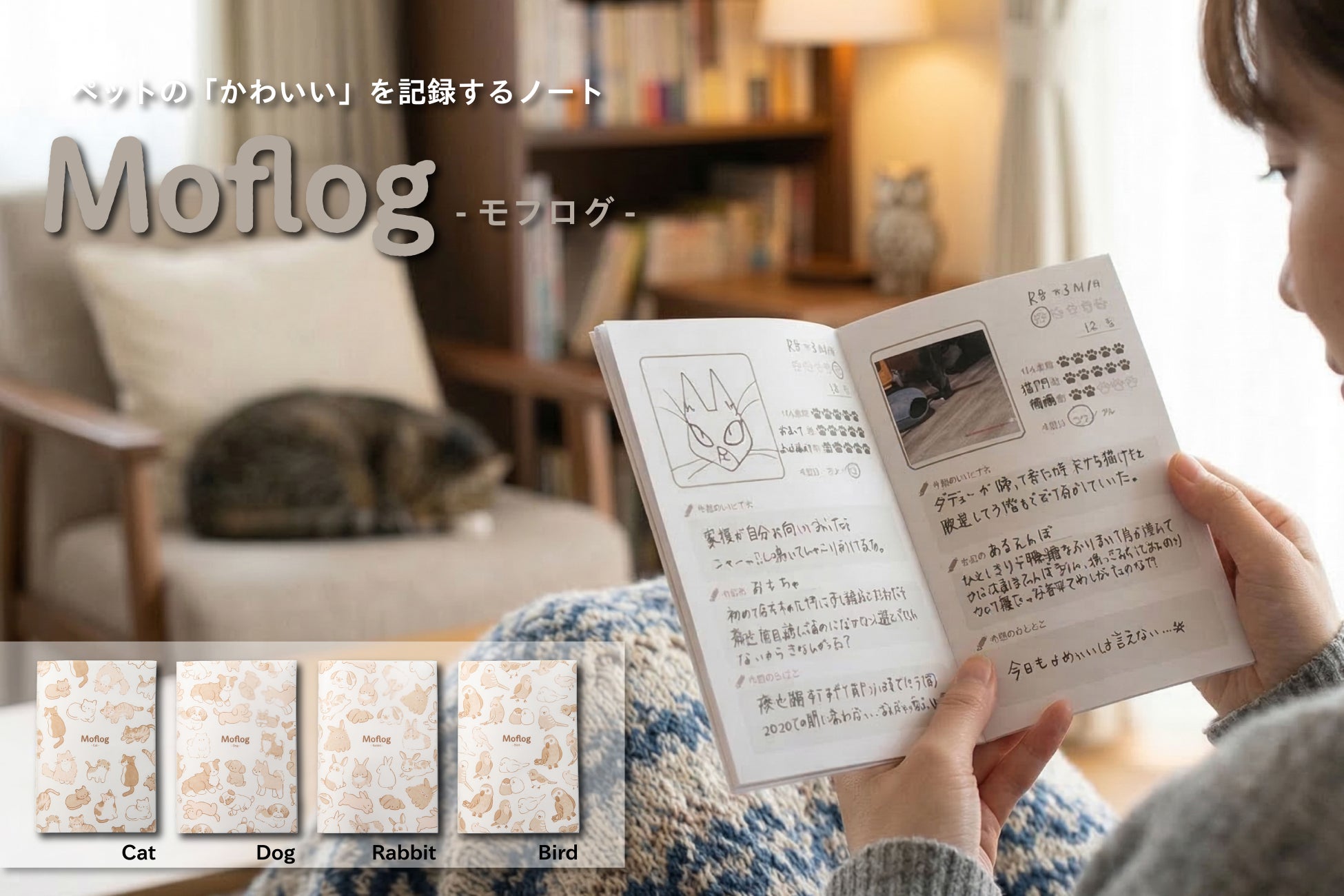 大阪書籍印刷株式会社(所在地:大阪市西淀川区、代表取締役:成田節夫)は、名古屋市立大学経済学部の山本奈央ゼミの学生たちとの共同開発で、ペットとのいとおしい日々をユーモアたっぷりに記録して振り返る「Moflog(モフログ)」を商品化しました。ノートの種類は、犬、猫、うさぎ、鳥の4種類。一般的なペットの健康記録や飼育日記とは少し異なり、日々の思い出やペットの表情・行動から伝わる気持ちなど“かわいい”を主に記録し、愛情をさらに深めることを目的としたノートです。ページの中身は各動物共通の項目だけでなく、猫なら「今日はツンデレのどちらか?」といった動物種別による独特の個性を反映。「今日のいとおしいポイント」や「今日のいたずら」などの項目を短文で埋める、いずれも簡単な記入方式で、記録のハードルが低く続けやすい仕様となっています。また、軽量で持ち運びもしやすく、いつでもどこでもペットのことを思い出すことができます。