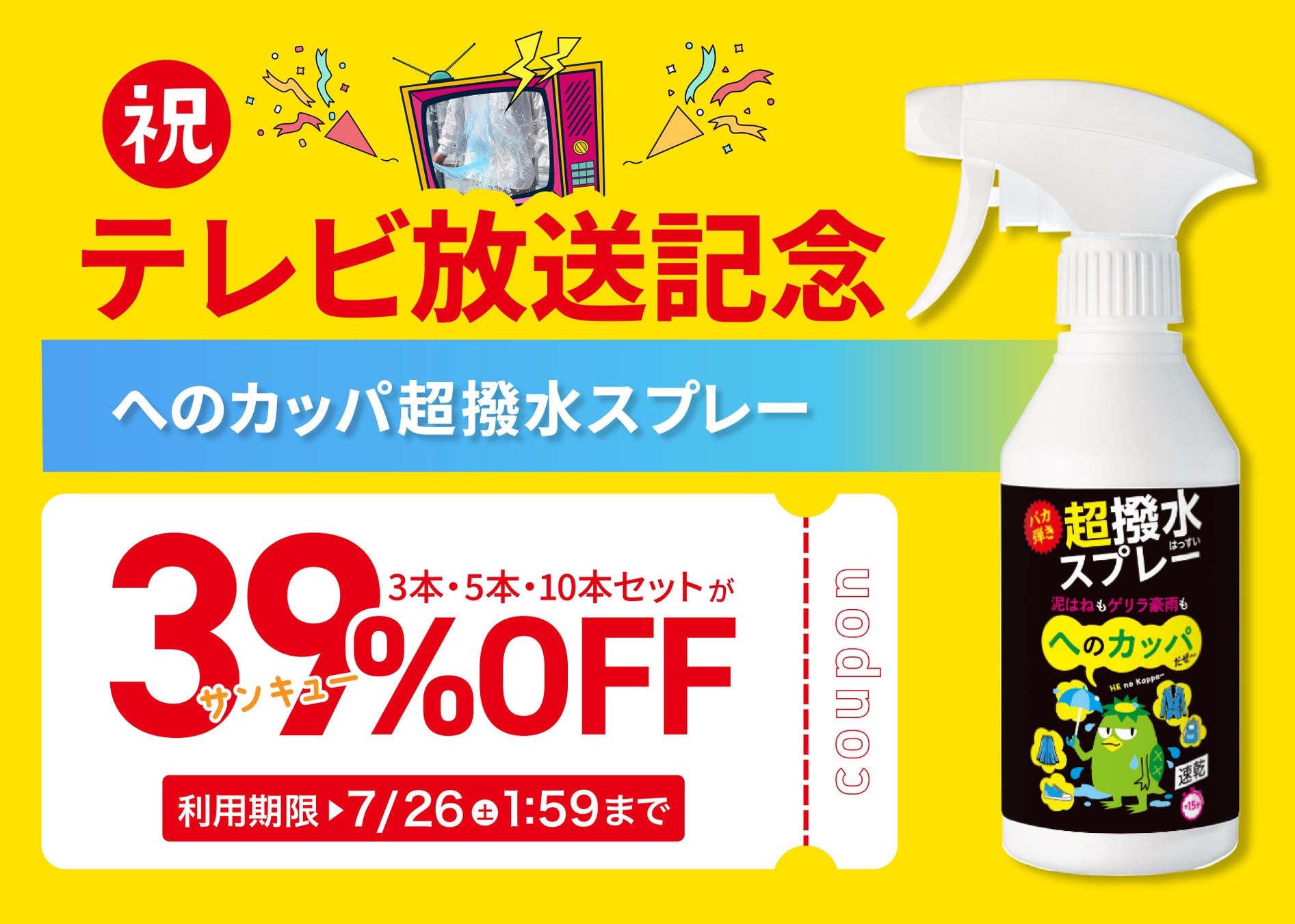 放送を記念し、「へのカッパ 超撥水スプレー」ご購入に使用できる《39%OFF(サンキュー)クーポン》を各販売ページで配布。クーポンのご利用で「へのカッパ 超撥水スプレー」3本・5本・10本セットが39%OFFでご購入いただけます。