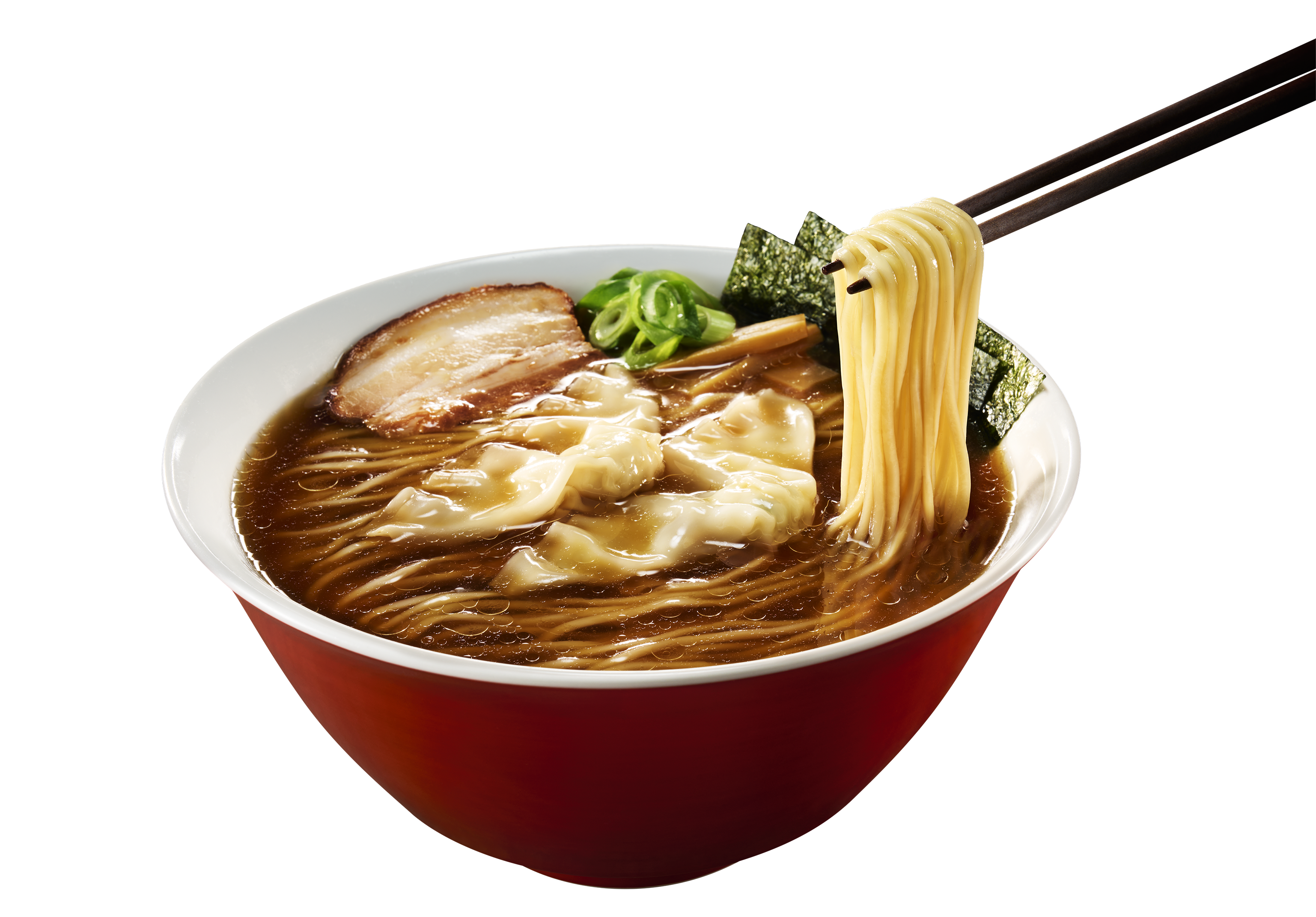 <具材> 皮の食感、具のほどけ度合にまでこだわったワンタン2個とチャーシュー、メンマ、九条ねぎ、のり2枚を盛り付けました。規格:494g / 価格:オープン価格