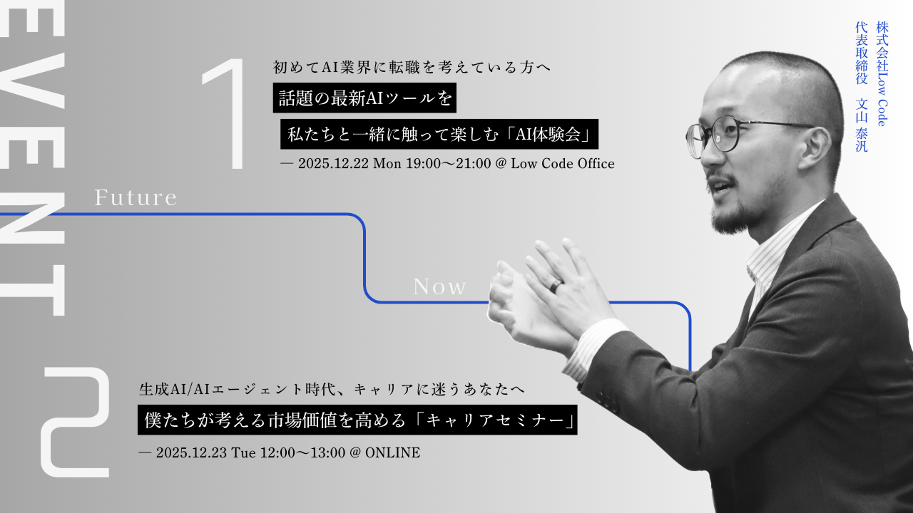 現在、Low Codeでは組織拡大に伴い、採用を大幅に強化しています。 私たちが大切にしているのは、今のスキルよりも「ポテンシャル」です。弊社独自の育成メソッドにより、未経験からでもAI活用やコンサルティングのプロフェッショナルへと成長できる環境を整えています。