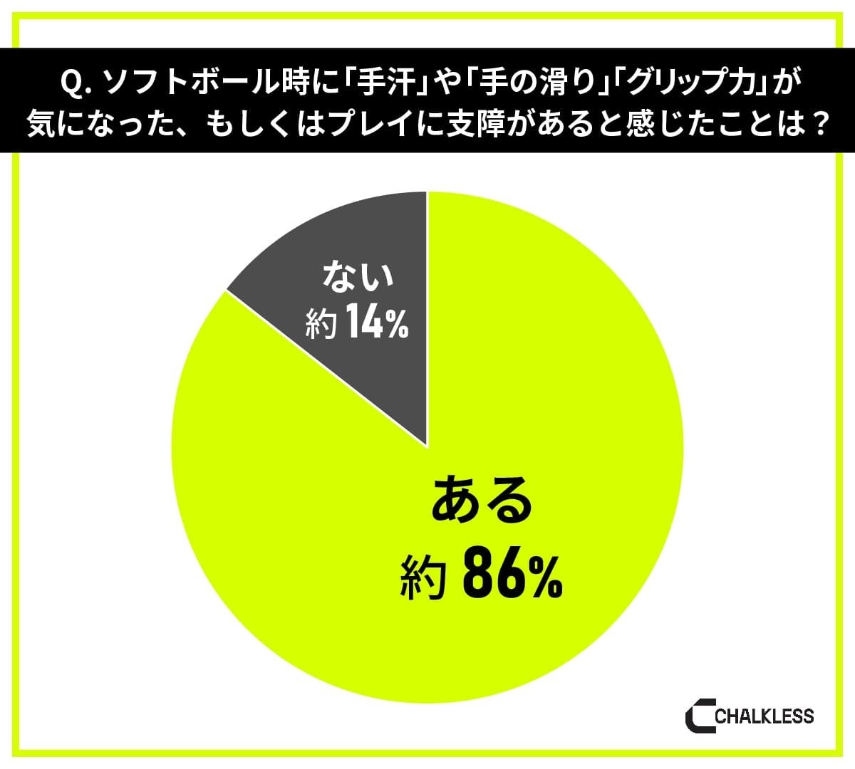 ソフトボールの最中に手汗や滑り、グリップ力が気になった人は約86%と、かなり高い割合で気になっていることがわかりました。