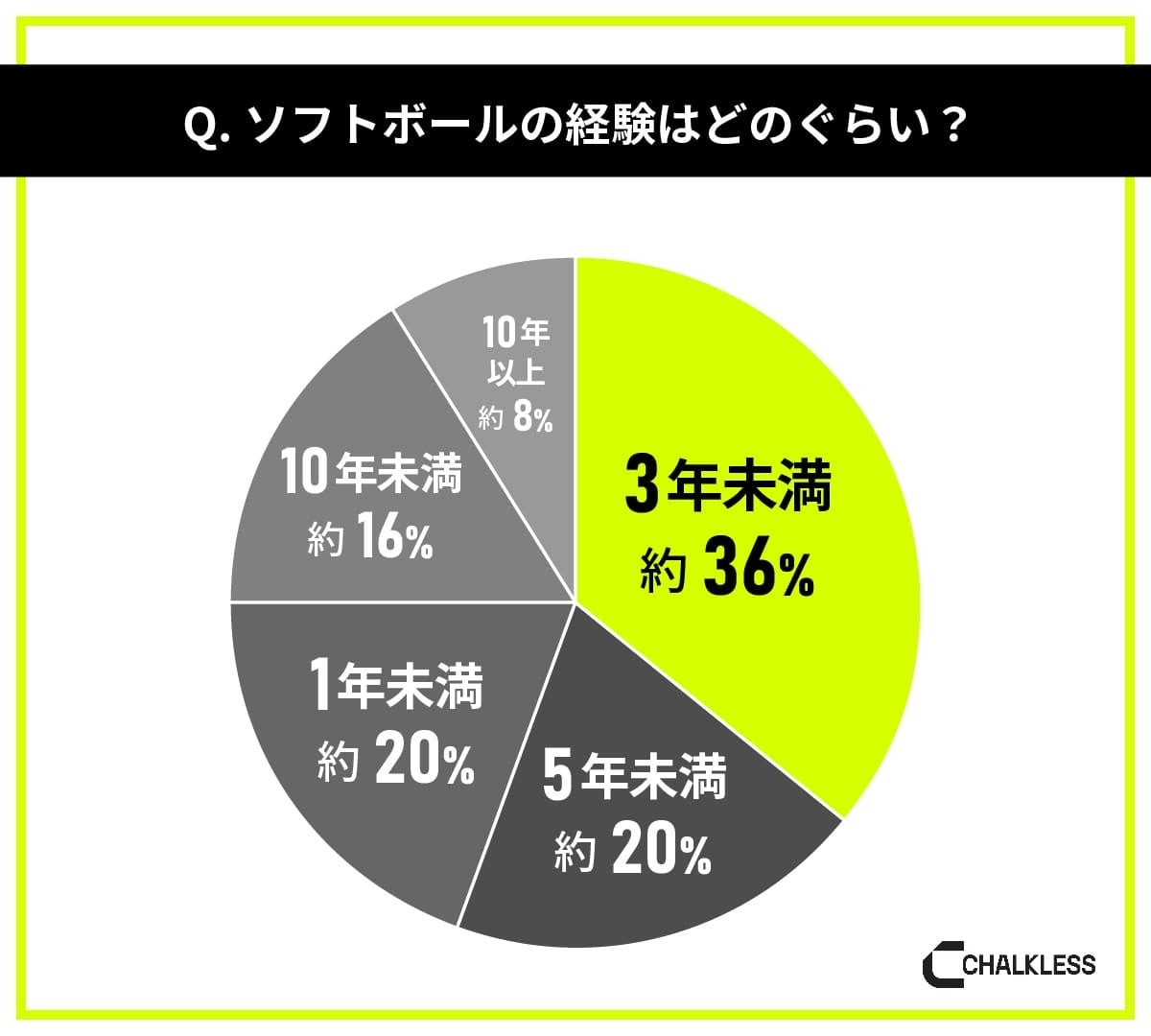 今回は全体として30〜40代、男性の回答者が若干多かったです。また、経験年数は5年未満までの層が多く、オフシーズンを除いて色々な気候シーンでソフトボールをプレイした人の回答となっています。