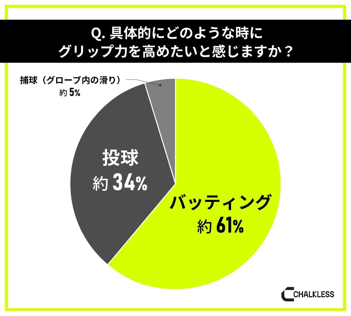 ソフトボール経験者の中でグリップ力や滑りにくさを高めたいと感じるシーンとしてバッティングと答えた人が約61%、投球が約34%、捕球が約5%いました。
