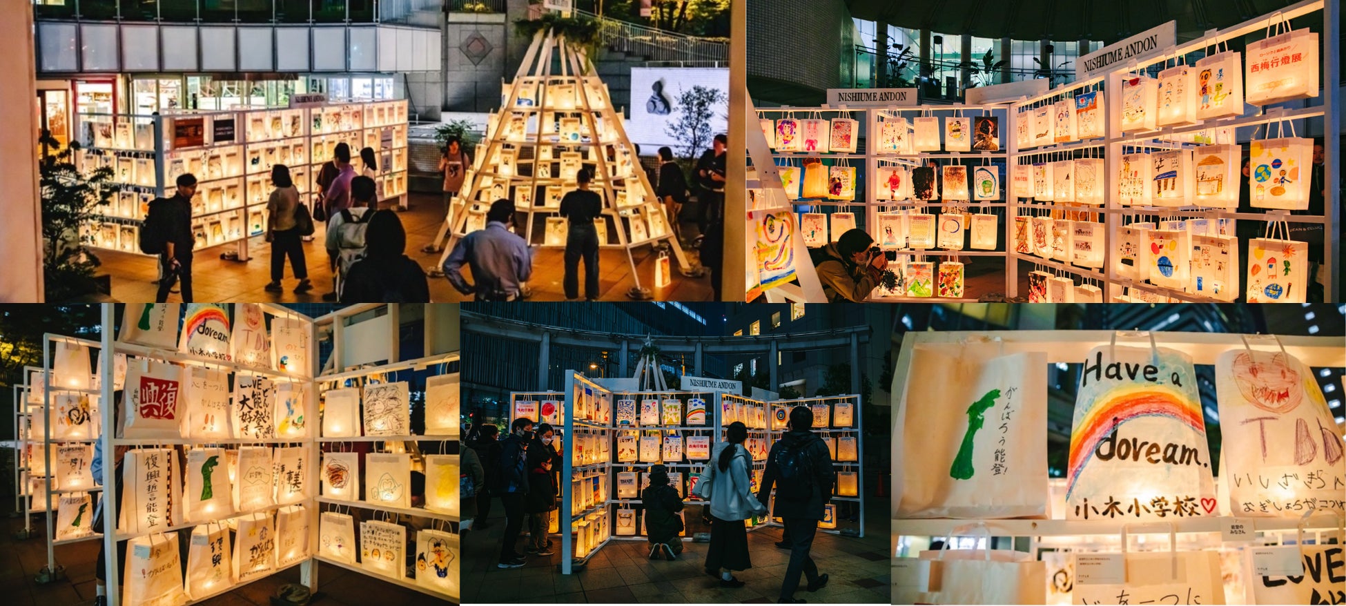 本イベントの伝統的なコンテンツのひとつが、ペーパーバッグを使った手作り行燈(あんどん)にキャンドルを灯して飾る「西梅行燈」。ひとつひとつに人々の夢・想い・願いを込めた優しい灯りがともります。西梅田エリアのお子さんやご家族、オフィスで働く皆さんをはじめ、昨年からは能登半島地震被災者の皆さんからも出展いただくなど、たくさんのアート行燈が会場を彩ります。