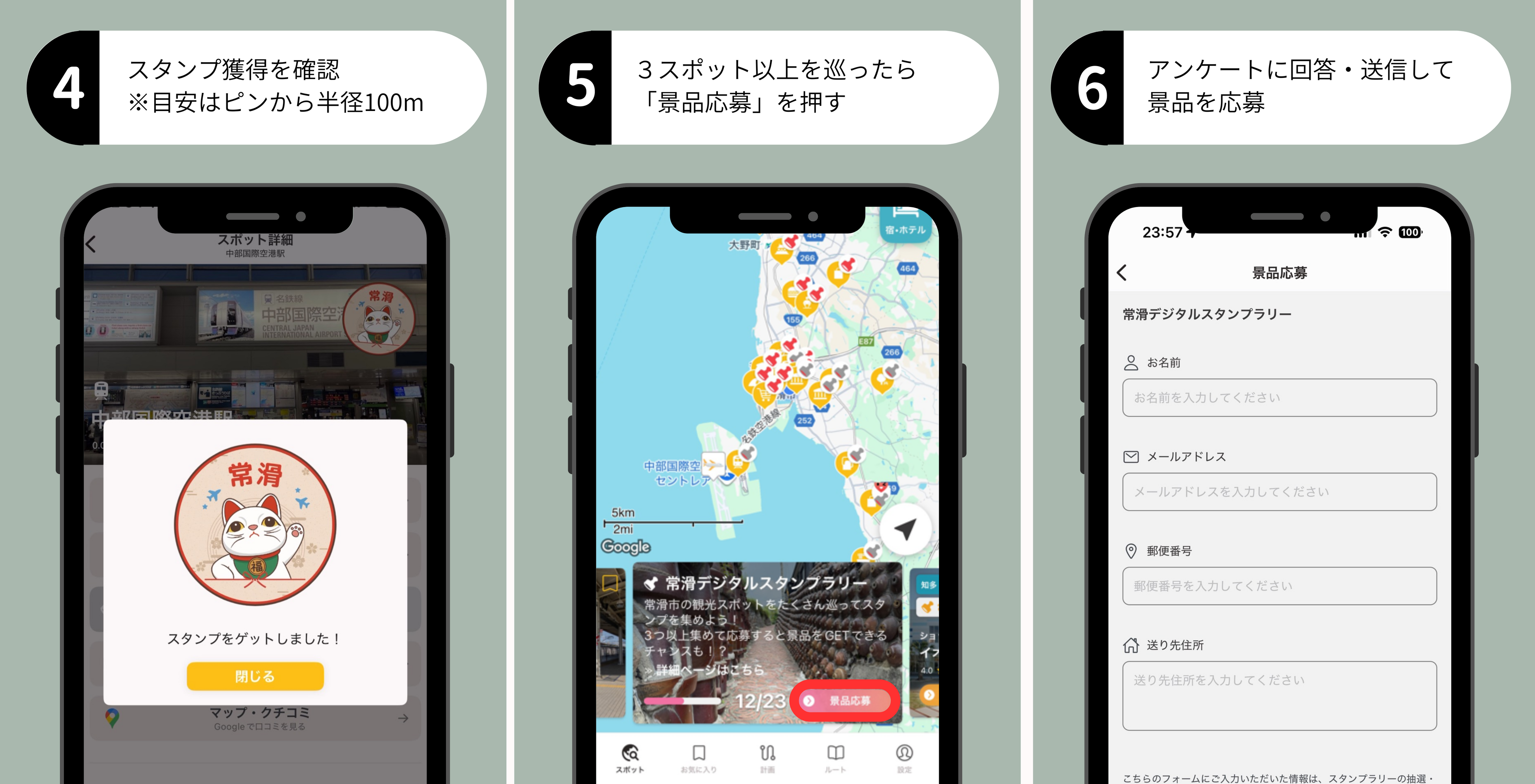 各スポットを巡って3つスタンプを集めると、抽選でもらえる景品に応募