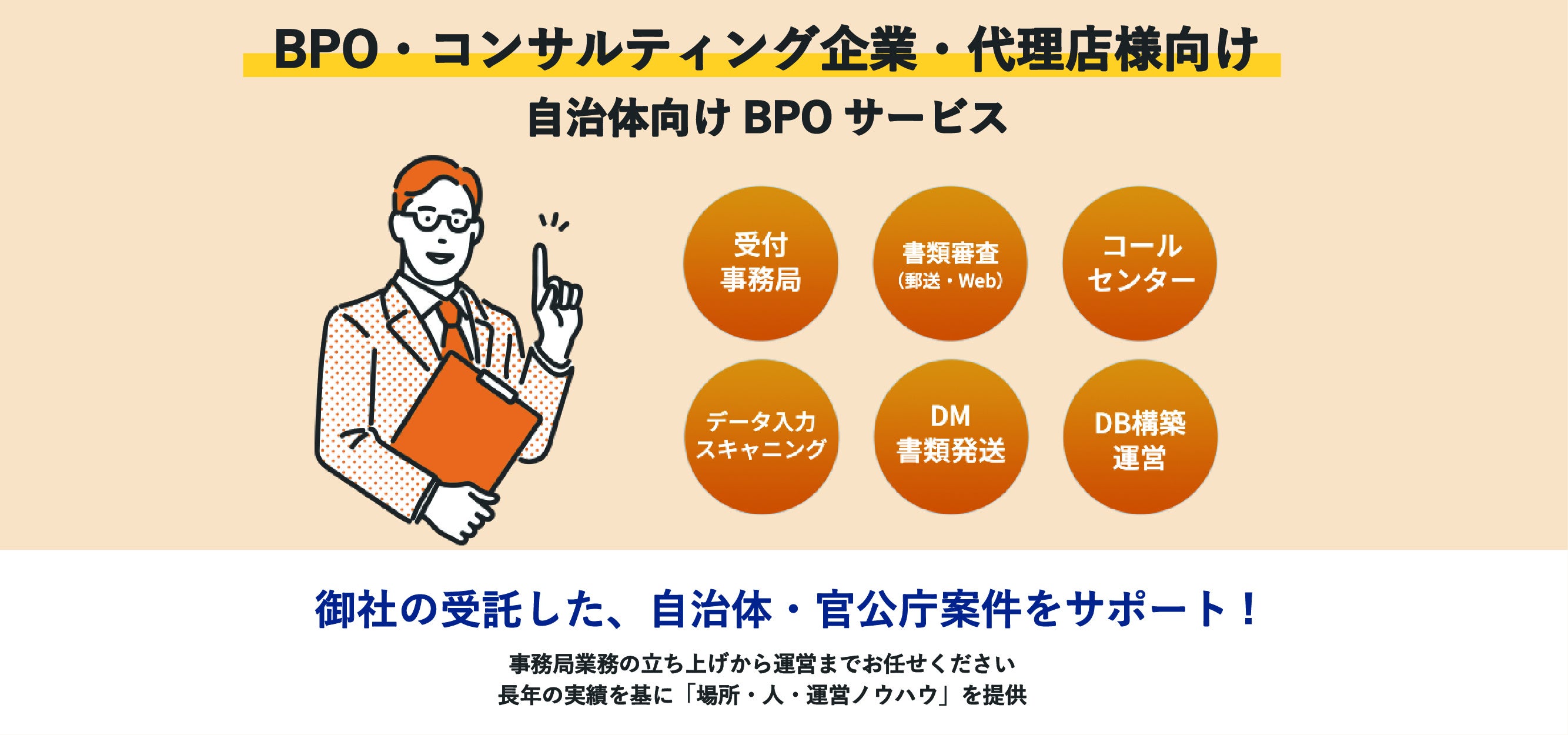 BPO・コンサルティング企業・代理店様向けの自治体 BPO 業務の支援サービスを提供しています。