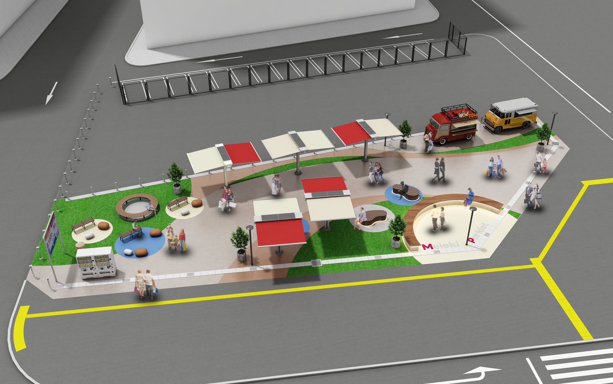 人々が気軽に立ち寄れる休憩場所として、エリア内にベンチやテーブルを整備。行き交う人々が思い思いに過ごせる、心地よい歩行空間を創出し、訪れる人を優しく迎えます。最大3台のキッチンカーが並び、“食べる・集まる・話す”が自然に生まれる賑わいの場を演出します。