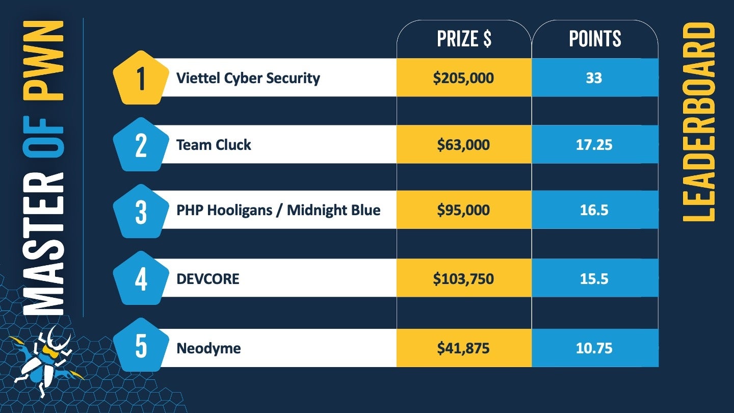 これにより、VCSはPwn2Own2024の全体ランキングで他チームを大きくリードし、米国のTeam Cluck(17.25ポイント)を大きく引き離しました。