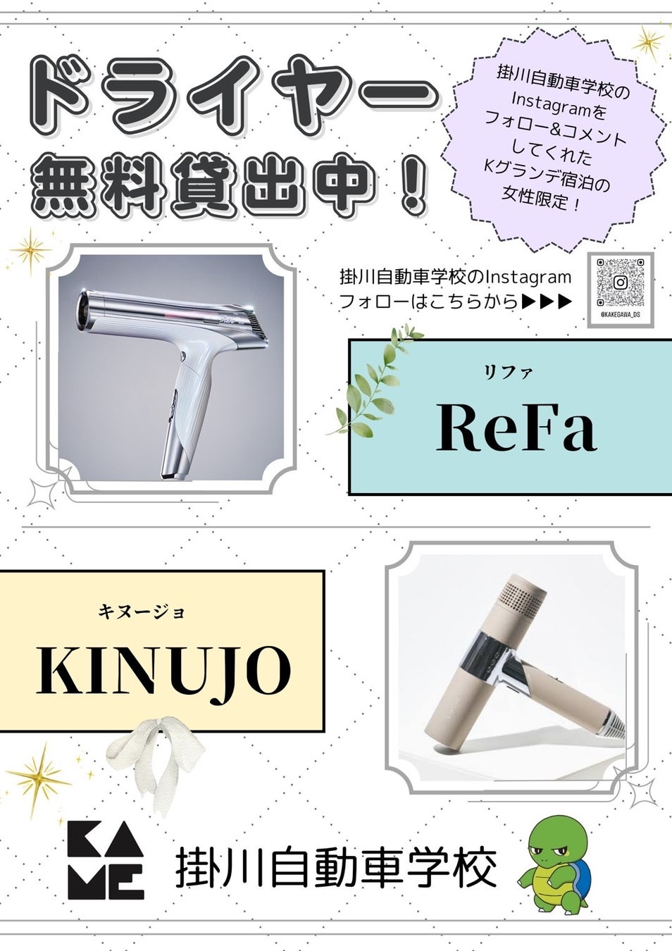 女性のお客様に快適な免許取得環境を提供するため、人気のドライヤー「ReFa」「KINUJO」の貸し出しを開始します。